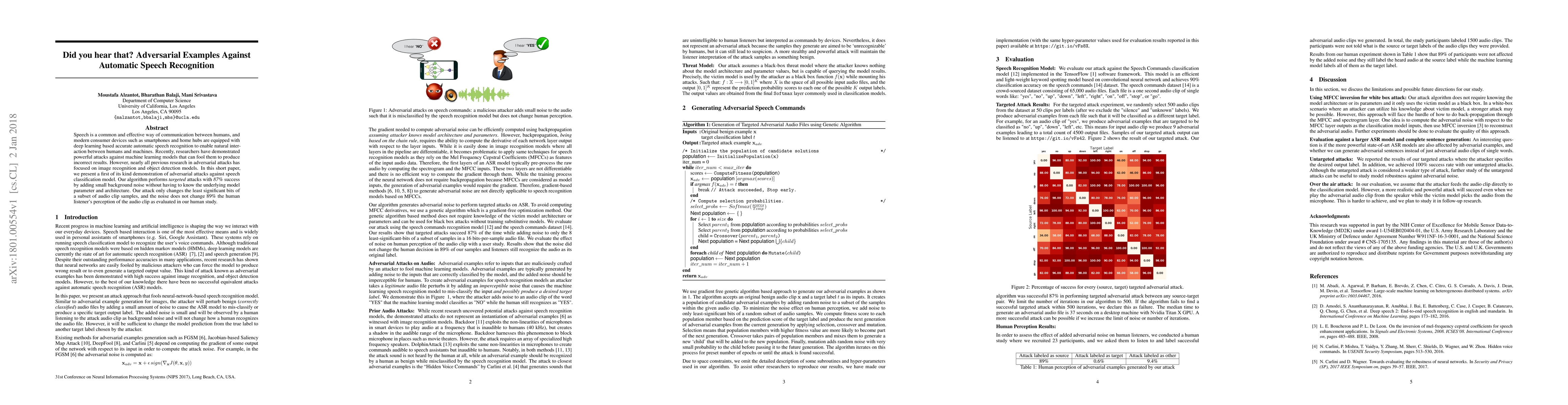 This paper demonstrates the first adversarial attacks against automatic speech recognition models, achieving 87% success through small background noise alterations that are imperceptible to human listeners. The attack modifies the least significant bits of audio samples without requiring knowledge of the model's internal parameters.
