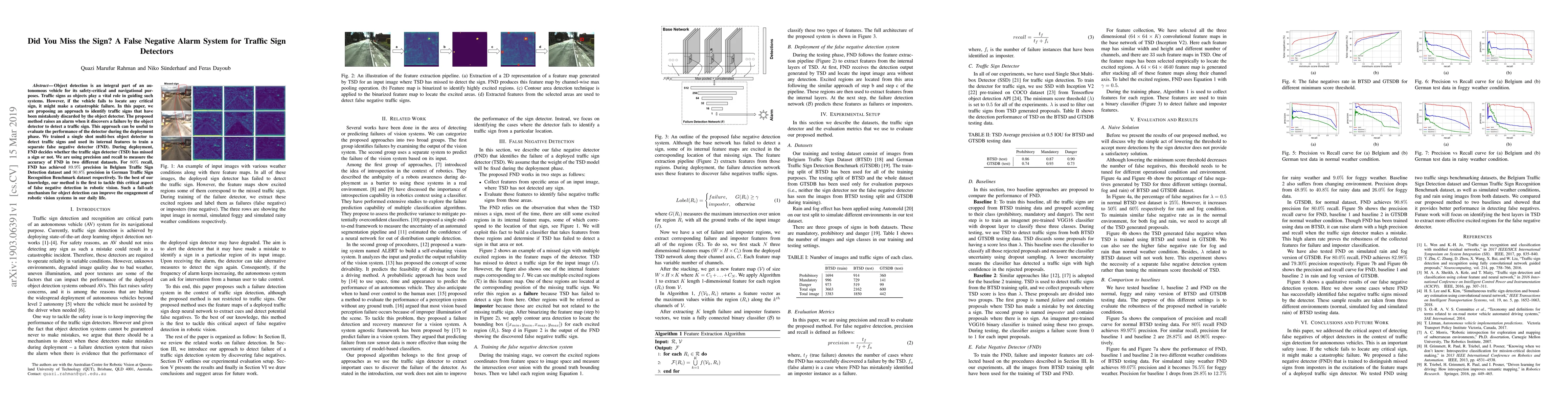 Object detection is an integral part of an autonomous vehicle for its safety-critical and navigational purposes. Traffic signs as objects play a vital role in guiding such systems. However, if the vehicle fails to locate any critical sign, it might make a catastrophic failure. In this paper, we propose an approach to identify traffic signs that have been mistakenly discarded by the object detector. The proposed method raises an alarm when it discovers a failure by the object detector to detect a traffic sign. This approach can be useful to evaluate the performance of the detector during the deployment phase. We trained a single shot multi-box object detector to detect traffic signs and used its internal features to train a separate false negative detector (FND). During deployment, FND decides whether the traffic sign detector (TSD) has missed a sign or not. We are using precision and recall to measure the accuracy of FND in two different datasets. For 80% recall, FND has achieved 89.9% precision in Belgium Traffic Sign Detection dataset and 90.8% precision in German Traffic Sign Recognition Benchmark dataset respectively. To the best of our knowledge, our method is the first to tackle this critical aspect of false negative detection in robotic vision. Such a fail-safe mechanism for object detection can improve the engagement of robotic vision systems in our daily life.