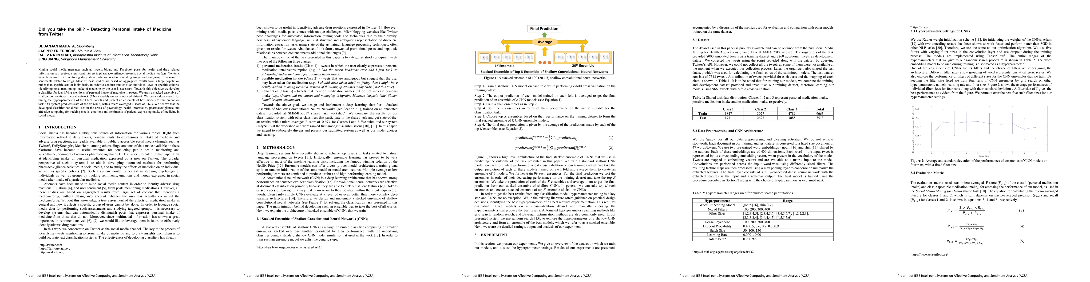 This paper develops a classifier using a stacked ensemble of CNN models to identify mentions of personal medicine intake in tweets from social media. The system achieves a micro-averaged F-score of 0.693, demonstrating its potential for applications in psychology, health informatics, and pharmacovigilance.