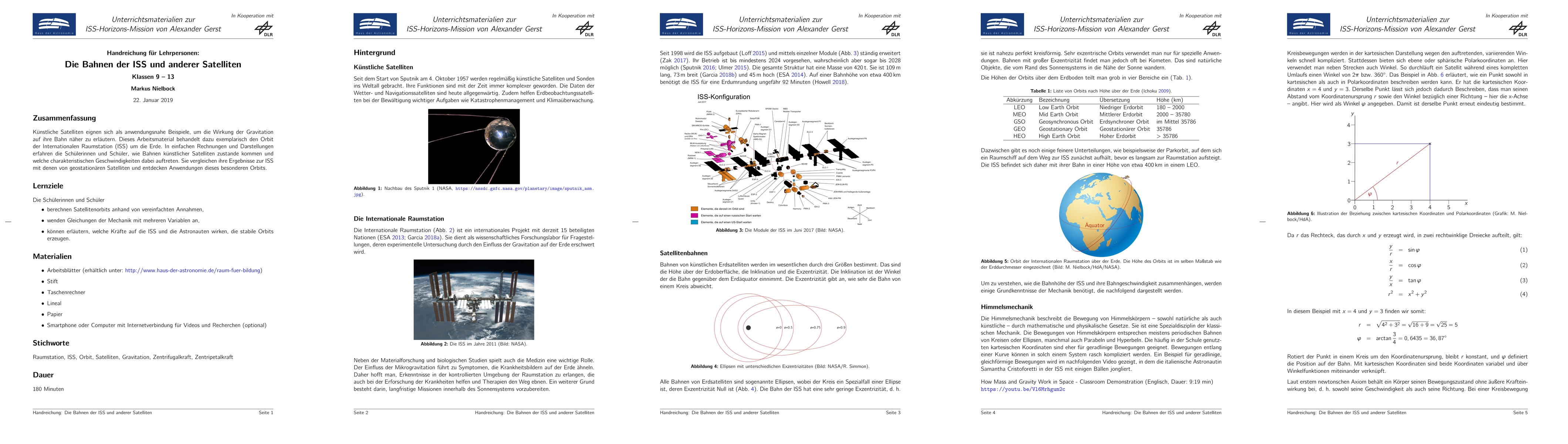 This activity was created within the framework of the "Space for Education" project, which ams at experiencing physical principles on the basis of topics related to space travel. Artificial satellites are suitable as application-oriented examples to explain the effect of gravity on their orbits. This working material deals with the orbit of the International Space Station (ISS) around the Earth. In simple calculations and representations, the students learn how the orbits of artificial satellites are created and which characteristic velocities occur. They compare their ISS results with those of geostationary satellites and discover applications of this particular orbit. Additional materials at: https://www.haus-der-astronomie.de/raum-fuer-bildung ----- Diese Aktivit\"at wurde im Rahmen des Projekts "Raum f\"ur Bildung" erstellt, welches physikalische Prinzipien anhand der Raumfahrt erlebbar macht. K\"unstliche Satelliten eignen sich als anwendungsnahe Beispiele, um die Wirkung der Gravitation auf ihre Bahn n\"aher zu erl\"autern. Dieses Arbeitsmaterial behandelt dazu exemplarisch den Orbit der Internationalen Raumstation (ISS) um die Erde. In einfachen Rechnungen und Darstellungen erfahren die Sch\"ulerinnen und Sch\"uler, wie Bahnen k\"unstlicher Satelliten zustande kommen und welche charakteristischen Geschwindigkeiten dabei auftreten. Sie vergleichen ihre Ergebnisse zur ISS mit denen von geostation\"aren Satelliten und entdecken Anwendungen dieses besonderen Orbits. Weitere Materialien unter: https://www.haus-der-astronomie.de/raum-fuer-bildung