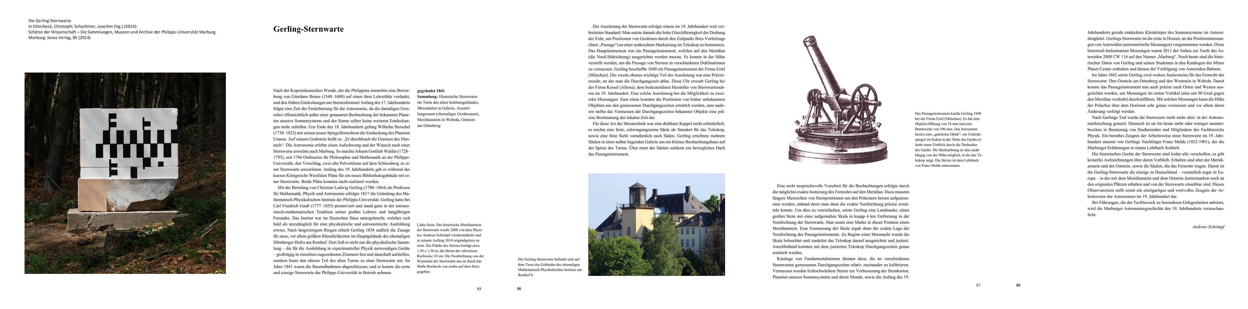 Christian Ludwig Gerling's 1817 appointment as Professor for Mathematics, Physics and Astronomy resulted in the foundation of the Mathematical and Physical Institute of the Philipps University. In 1838, Gerling moved onto new premises in the main building of the former D\"ornberger Hof in Renthof Street where the Philipps University's astronomical observatory was installed in the upper part of the old tower in 1841. The most important device at that time was a transit instrument which served to measure the transit times of stars in the meridian. Precise alignment required the use of a meridian stone, an artificial point of reference exactly north of and at about four kilometers' distance from the observatory. The scientists observed planets and their moons, the asteroids that were only discovered at the beginning of the 19th century, and some fainter stars in order to improve stellar charts. The Gerling Observatory is the first place in Hesse, where positions of asteroids were read.