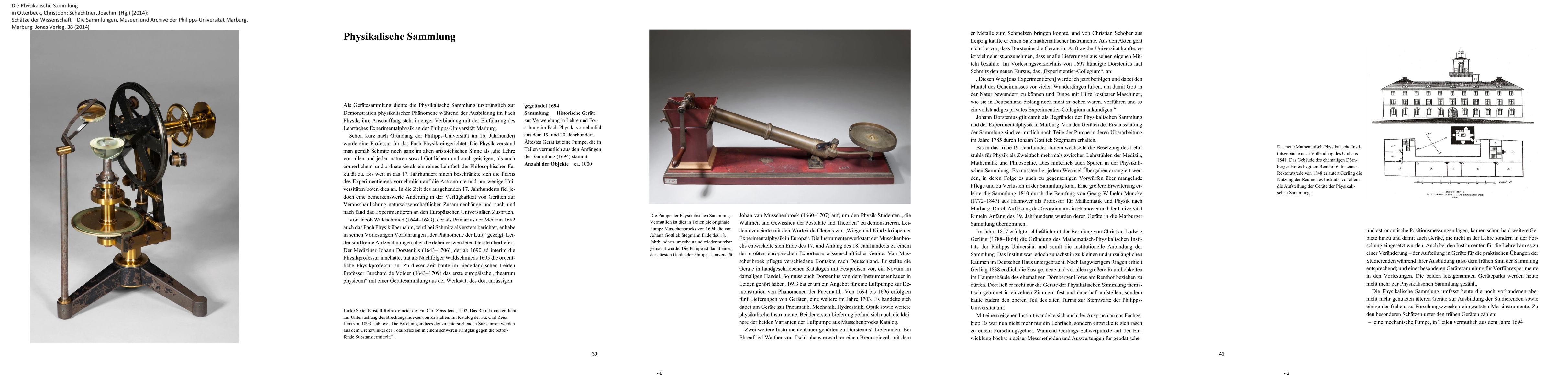 At the end of the 17th century, the collection was established through the acquisition of Leiden instrumentmaker Musschenbroek's collection. Its aim was to demonstrate physical phenomena. Until the end of the 18th century, the collection was used and extended by a number of professors from various university departments in teaching mechanics, hydrostatics, optics and electrostatics. The foundation of the Institute for Mathematics and Physics in 1817 and the appointment of Christian Ludwig Gerling to the position of Professor for Mathematics, Physics and Astronomy strengthened the subject considerably. Gerling extended the collection mainly with devices for geodesy and astronomy, with more instruments being added in the time up to the middle of the 20th century. Today, the collection allows an insight into the history of scientific instruments as witnesses of the past.