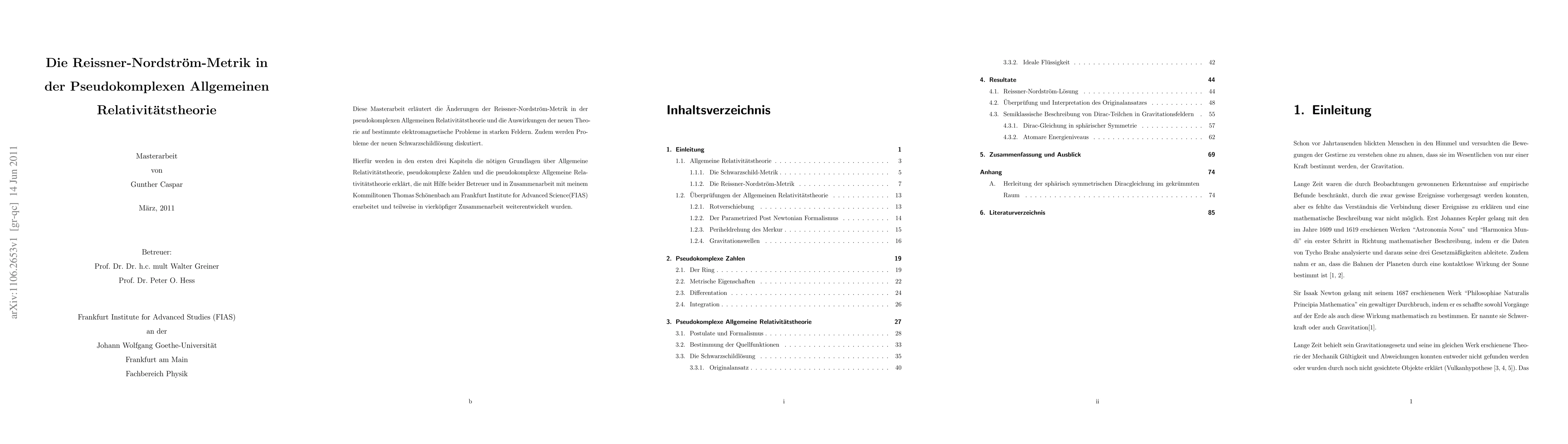 This master thesis discusses the Reissner-Nordstr\"om metric and the dirac equation in curved spaces in the pseudo-complex General Relativity (pc-GR) and reviews the original ansatz of pc-GR. It is written in German.