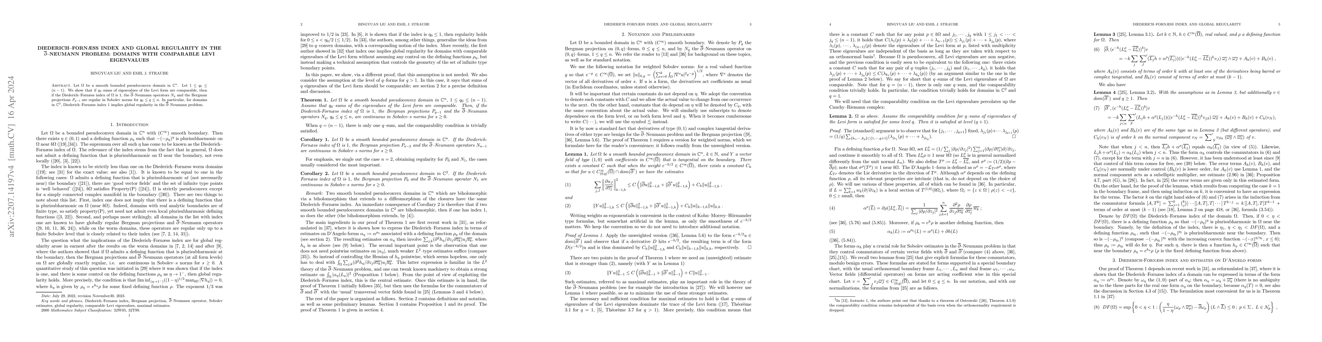 Let $\Omega$ be a smooth bounded pseudoconvex domain in $\mathbb{C}^{n}$. Let $1\leq q_{0}\leq (n-1)$. We show that if $q_{0}$--sums of eigenvalues of the Levi form are comparable, then if the Diederich--Forn\ae ss index of $\Omega$ is $1$, the $\overline{\partial}$--Neumann operators $N_{q}$ and the Bergman projections $P_{q-1}$ are regular in Sobolev norms for $q_{0}\leq q\leq n$. In particular, for domains in $\mathbb{C}^{2}$, Diederich--Forn\ae ss index $1$ implies global regularity in the $\overline{\partial}$--Neumann problem.