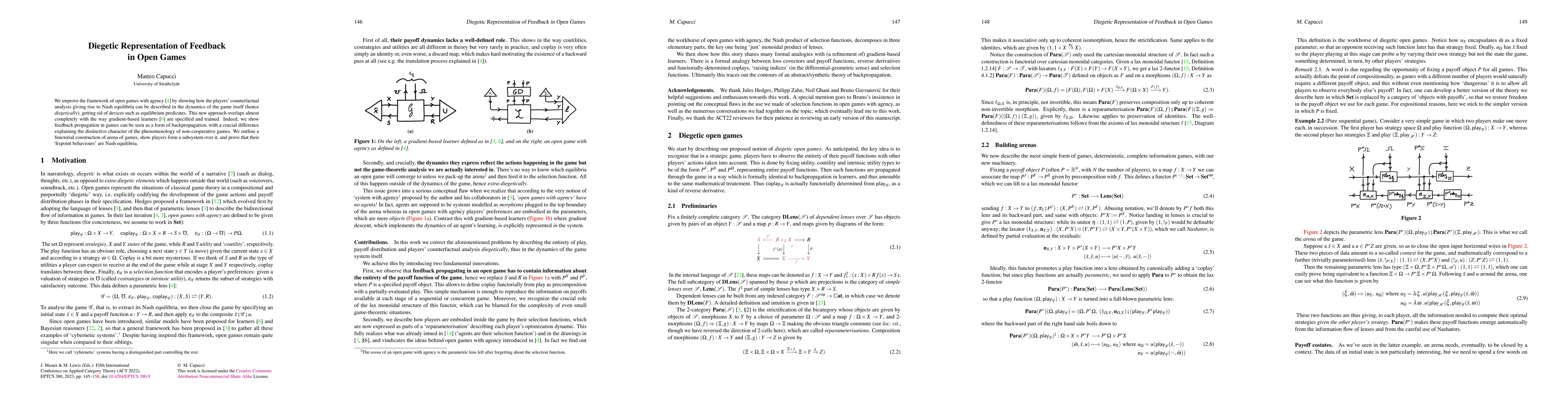 This paper introduces a diegetic framework for open games where players' counterfactual analysis leading to Nash equilibria is embedded within the game dynamics, eliminating external equilibrium predicates. It draws parallels between feedback propagation in games and backpropagation in gradient-based learning, highlighting the unique phenomenology of non-cooperative games.