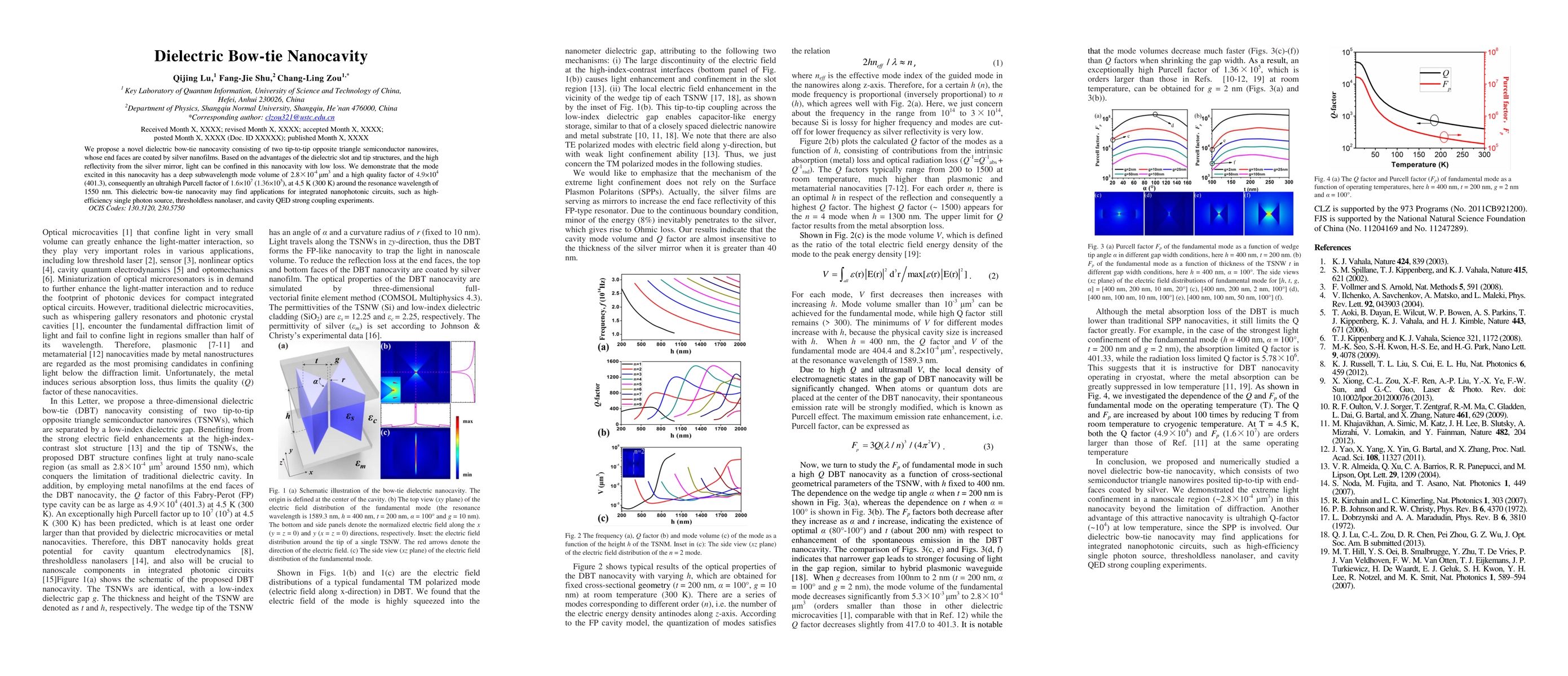 This paper proposes a dielectric bow-tie nanocavity made of semiconductor nanowires coated with silver nanofilms, achieving low-loss light confinement. It demonstrates a subwavelength mode volume and high quality factor, suggesting potential for applications in integrated nanophotonic circuits like single photon sources and nanolasers.