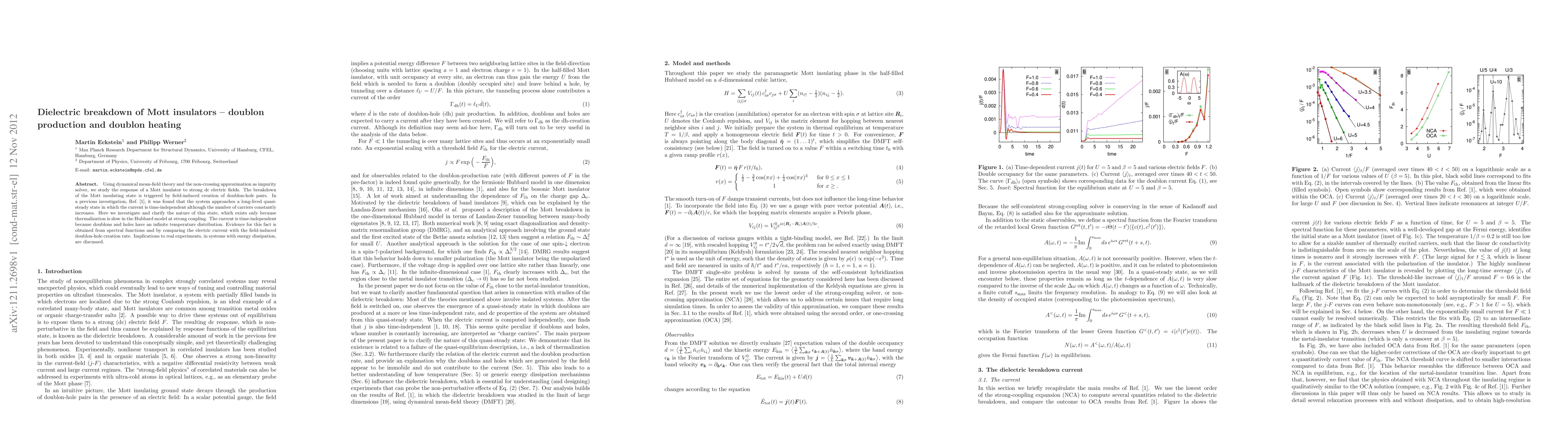 This paper investigates the dielectric breakdown of Mott insulators under strong dc electric fields, revealing that the breakdown is caused by the field-induced creation of doublon-hole pairs. The study finds that the system enters a quasi-steady state with time-independent current due to the infinite temperature distribution of doublons and holes, supported by spectral function analysis.