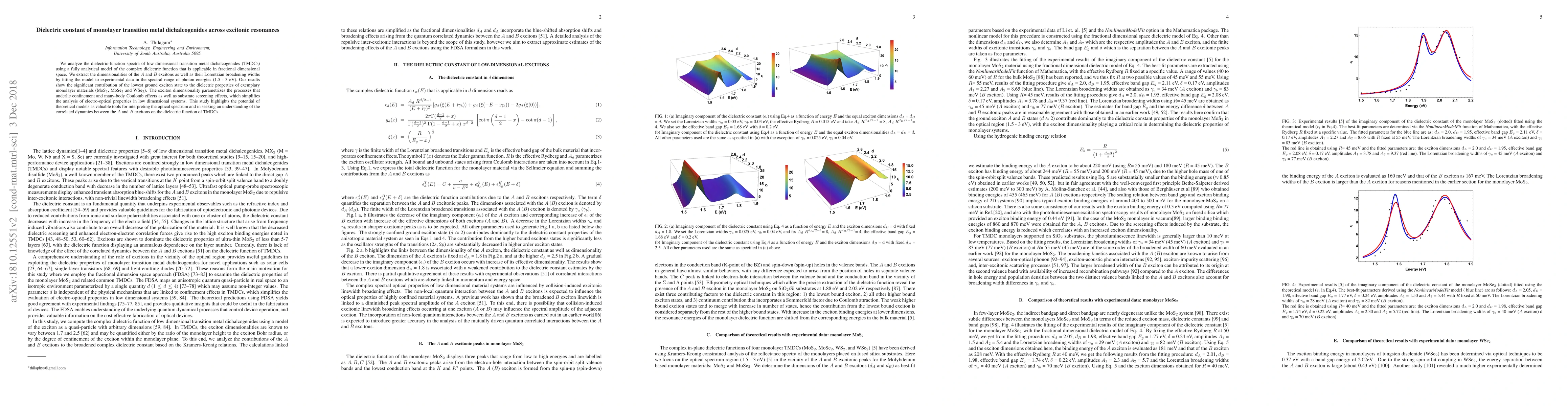 We analyze the dielectric-function spectra of low dimensional transition metal dichalcogenides (TMDCs) using a fully analytical model of the complex dielectric function that is applicable in fractional dimensional space. We extract the dimensionalities of the $A$ and $B$ excitons as well as their Lorentzian broadening widths by fitting the model to experimental data in the spectral range of photon energies (1.5 - 3 eV). Our results show the significant contribution of the lowest ground exciton state to the dielectric properties of exemplary monolayer materials (MoS$_2$, MoSe$_2$ and WSe$_2$). The exciton dimensionality parametrizes the processes that underlie confinement and many-body Coulomb effects as well as substrate screening effects, which simplifies the analysis of electro-optical properties in low dimensional systems. This study highlights the potential of theoretical models as valuable tools for interpreting the optical spectrum and in seeking an understanding of the correlated dynamics between the $A$ and $B$ excitons on the dielectric function of TMDCs.