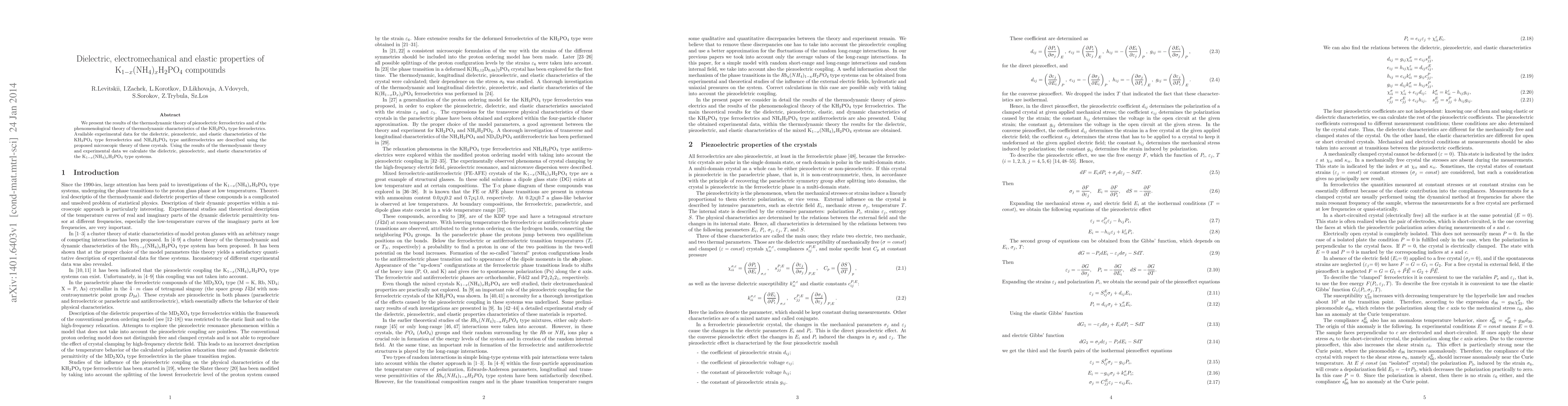 We present the results of the thermodynamic theory of piezoelectric ferroelectrics and of the phenomenological theory of thermodynamic characteristics of the KH$_{2}$PO$_{4}$ type ferroelectrics. Available experimental data for the dielectric, piezoelectric, and elastic characteristics of the KH$_{2}$PO$_{4}$ type ferroelectrics and NH$_4$H$_{2}$PO$_{4}$ type antiferroelectrics are described using the proposed microscopic theory of these crystals. Using the results of the thermodynamic theory and experimental data we calculate the dielectric, piezoelectric, and elastic characteristics of the K$_{1-x}$(NH$_4$)$_x$H$_2$PO$_4$ type systems.
