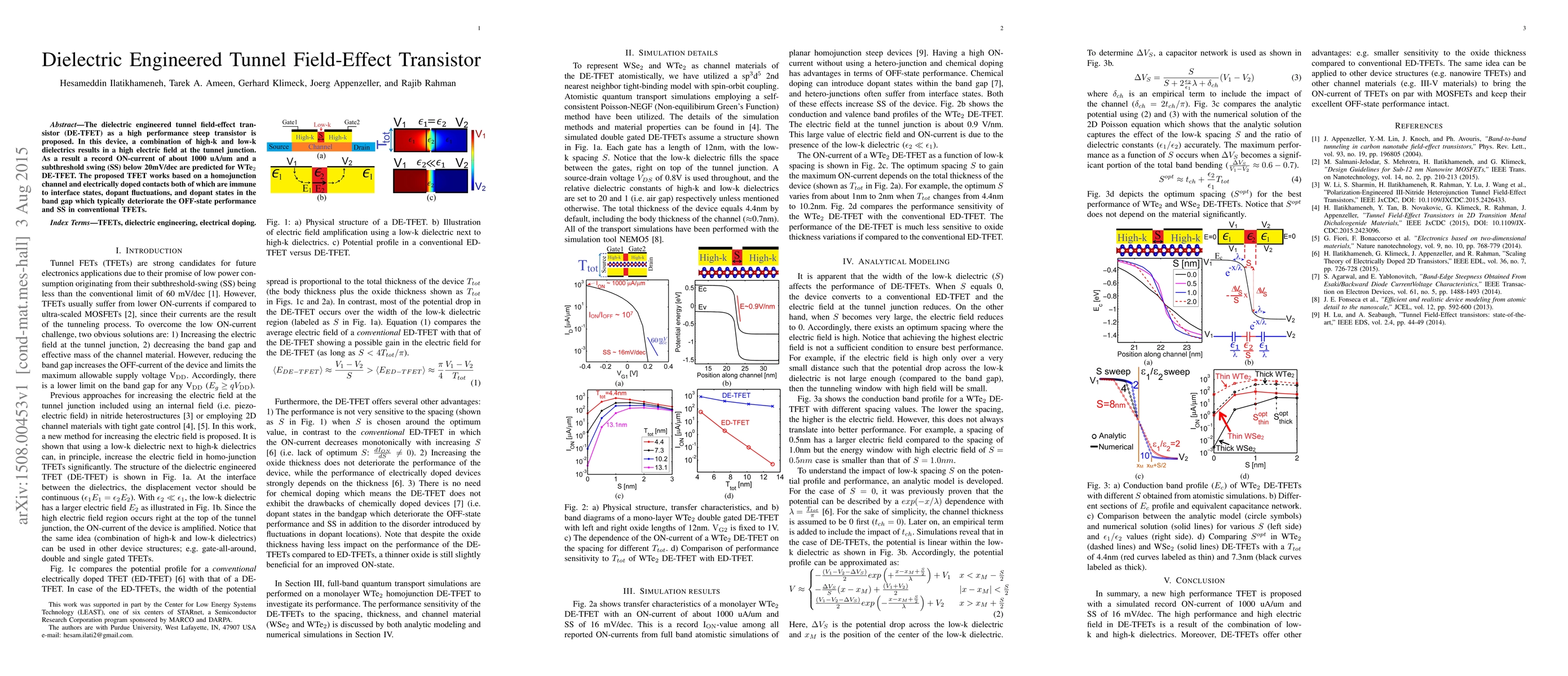 The paper proposes a dielectric engineered tunnel field-effect transistor (DE-TFET) with high performance, achieving a record ON-current and a subthreshold swing below 20 mV/dec, utilizing a combination of high-k and low-k dielectrics to enhance the electric field at the tunnel junction. The device features a homojunction channel and electrically doped contacts, mitigating issues like interface states and dopant fluctuations that typically degrade conventional TFETs.
