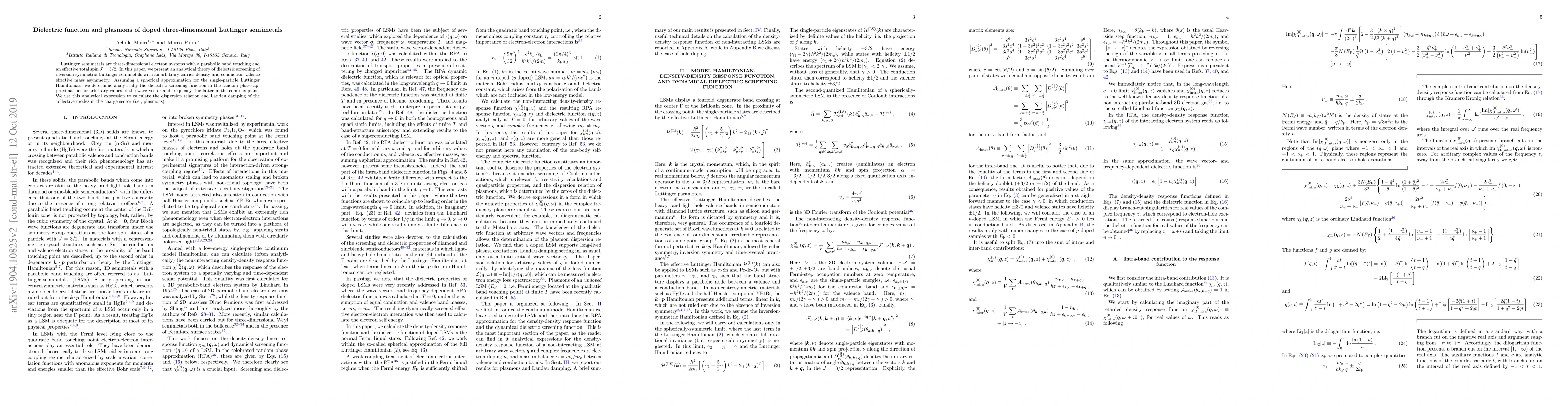 This paper develops an analytical theory for the dielectric screening and plasmons in doped three-dimensional Luttinger semimetals, determining the dielectric screening function and calculating the dispersion relation and Landau damping of plasmons under various conditions.