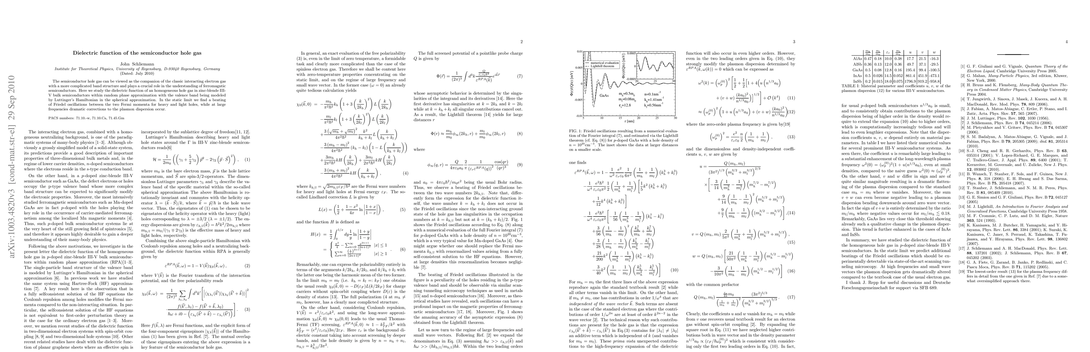This study investigates the dielectric function of hole gases in p-doped zinc-blende III-V semiconductors, finding that in the static limit, Friedel oscillations interfere between heavy and light holes, and at high frequencies, significant corrections to plasmon dispersion emerge.
