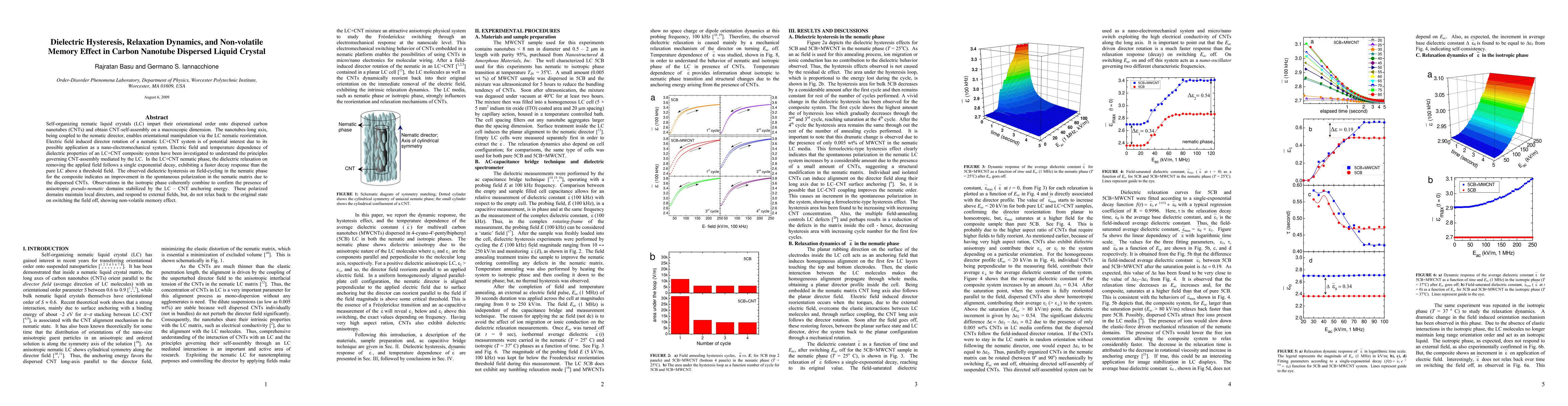 The self-organizing properties of nematic liquid crystals (LC) can be used to template carbon nanotubes (CNTs) on a macroscopic dimension. The nematic director field, coupled to the dispersed CNT long-axis, enables controlled director reorientation using well-established methods of LC alignment techniques, such as patterned-electrode-surface, electric fields, and magnetic fields. Electric field induced director rotation of a nematic LC+CNT system is of potential interests due to its possible applications as a nano electromechanical system. The relaxation mechanism for a LC+CNT composite, on the removal of the applied field, reveals the intrinsic dynamics of this anisotropic system. Dielectric hysteresis and temperature dependence of the dielectric constant coherently shows the ferroelectric-type behavior of the LC+CNT system in the nematic phase. The strong surface anchoring of LC molecules on CNT walls results in forming local isolated pseudo-nematic domains in the isotropic phase. These domains, being anisotropic, respond to external fields, but, do not relax back to the original state on switching of the field off, showing non-volatile memory effect.