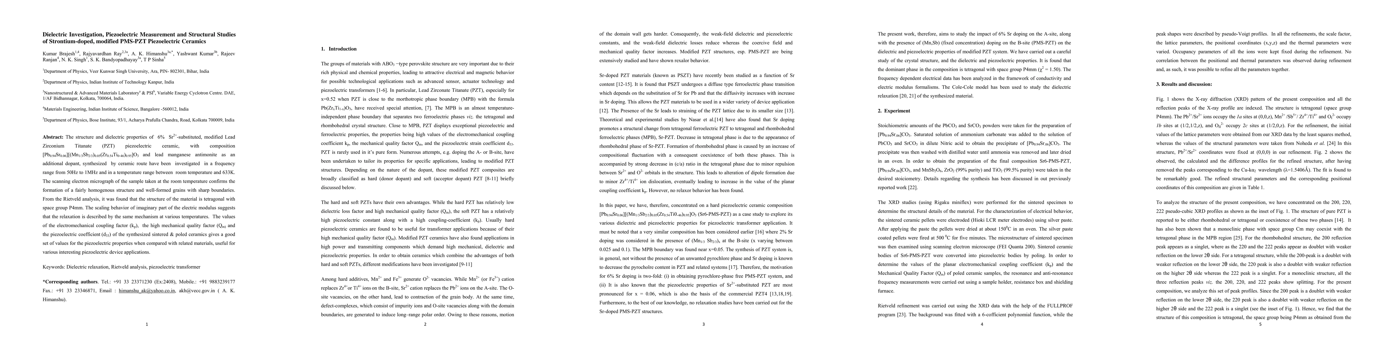 This paper investigates the dielectric properties, piezoelectric measurement, and structural studies of 6% strontium-doped modified PMS-PZT piezoelectric ceramics. The material exhibits tetragonal structure with favorable piezoelectric properties, including high electromechanical coupling factor and mechanical quality factor, making it suitable for piezoelectric device applications.