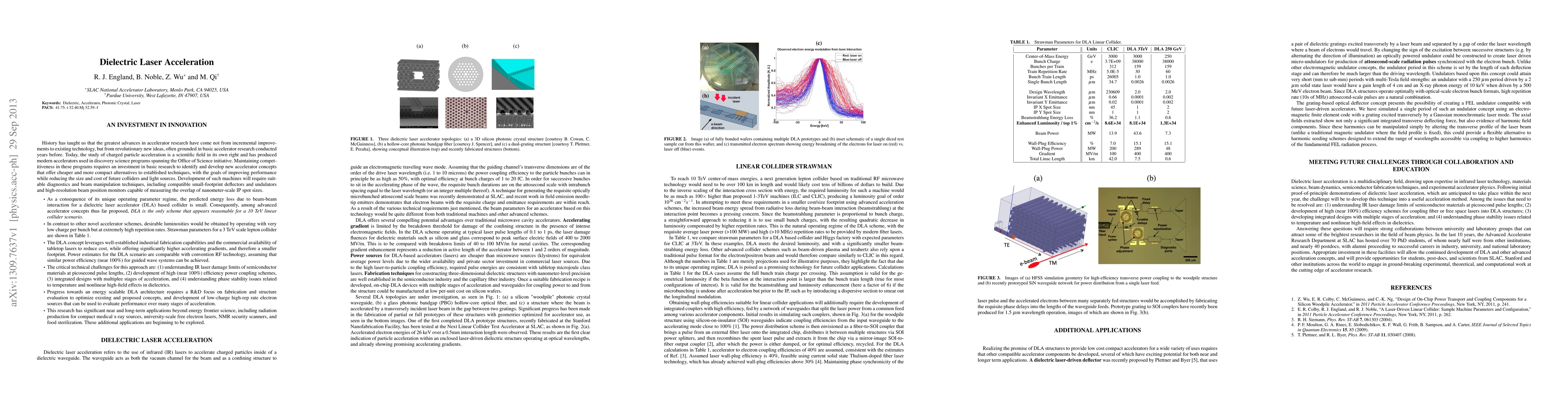 Summary: Recent advances in particle acceleration via dielectric near-field structures driven by infrared lasers, termed Dielectric Laser Accelerators, are detailed, with potential implications for high energy physics and other applications.