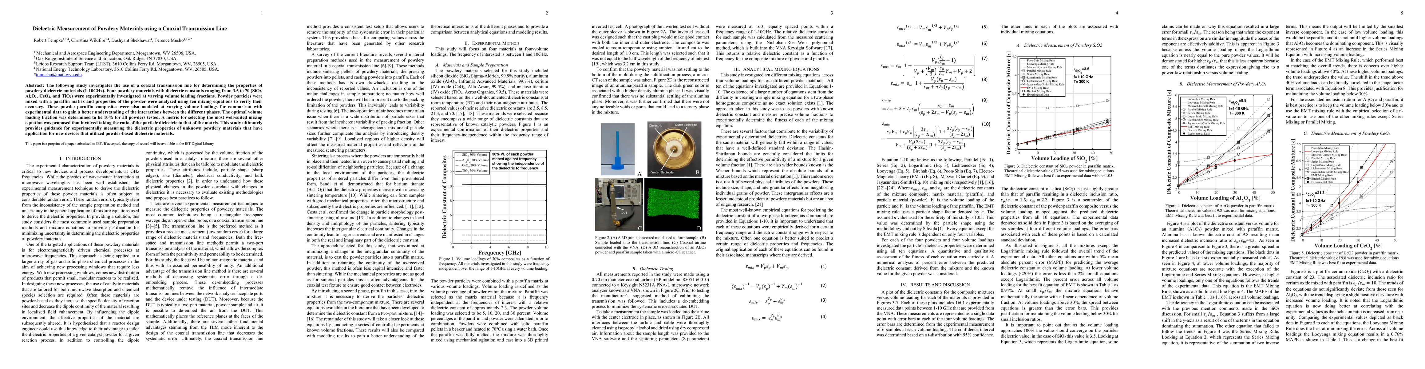 The following study investigates the use of a coaxial transmission line for determining the properties of powdery dielectric materials (1-10GHz). Four powdery materials with dielectric constants ranging from 3.5 to 70 (SiO$_2$, Al$_2$O$_3$, CeO$_2$, and TiO$_2$) were experimentally investigated at varying volume loading fractions. Powder particles were mixed with a paraffin matrix and properties of the powder were analyzed using ten mixing equations to verify their accuracy. These powder-paraffin composites were also modeled at varying volume loadings for comparison with experimental data to gain a better understanding of the interactions between the different phases. The optimal volume loading fraction was determined to be 10% for all powders tested. A metric for selecting the most well-suited mixing equation was proposed that involved taking the ratio of the particle dielectric to that of the matrix. This study ultimately provides guidance for experimentally measuring the dielectric properties of unknown powdery materials that have application for new devices that utilized powder-based dielectric materials.