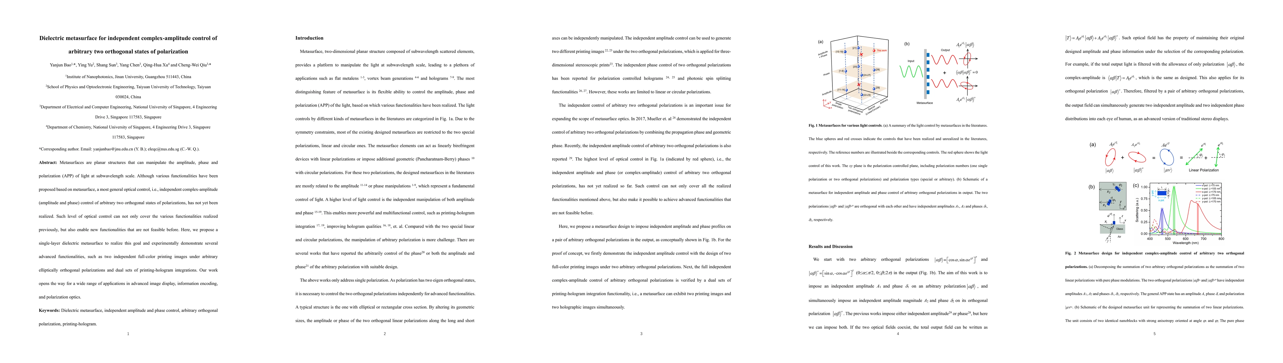 This paper proposes a dielectric metasurface enabling independent complex-amplitude control of light's amplitude and phase for arbitrary two orthogonal polarization states, demonstrating advanced functionalities like dual-polarization full-color printing and holograms, paving the way for advanced imaging and information encoding applications.