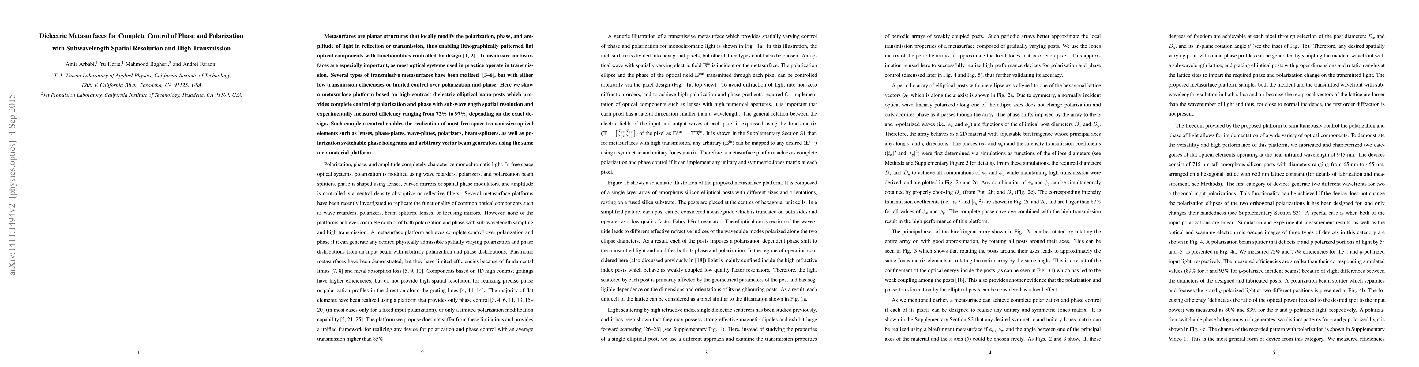 This paper presents a novel dielectric metasurface composed of elliptical nano-posts that achieves complete control over phase and polarization with subwavelength resolution and high transmission efficiency (72%-97%). This platform enables the realization of various optical elements, including lenses, phase-plates, and polarization switchable holograms.