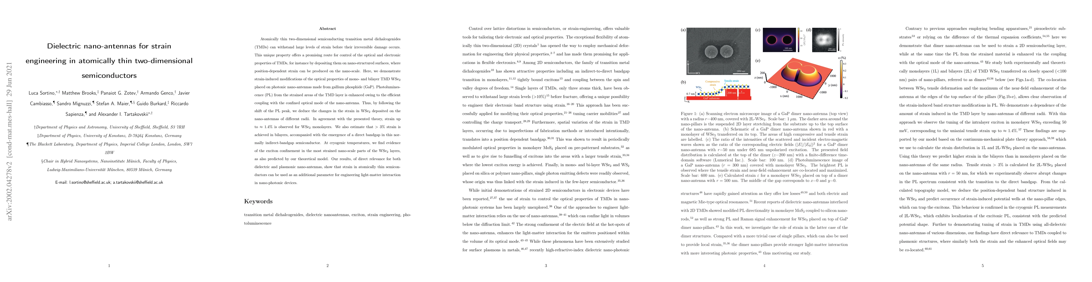 This paper demonstrates that dielectric nano-antennas can induce significant strain in atomically thin WSe$_2$ layers, modifying their optical properties. Strain up to 1.4% in monolayers and >3% in bilayers is achieved, leading to direct bandgap formation and exciton confinement, enhancing photoluminescence and showing potential for engineering light-matter interactions in nano-photonic devices.