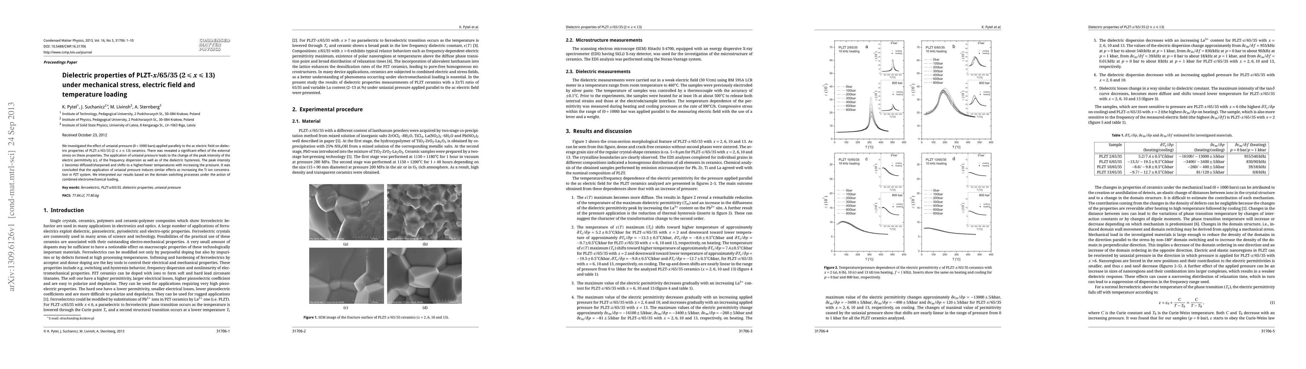 This study investigates how uniaxial pressure (0-1000 bars) affects the dielectric properties of PLZT-x/65/35 ceramics under electric field and temperature loading. The results show significant changes in electric permittivity peak intensity, frequency dispersion, and dielectric hysteresis due to mechanical stress.