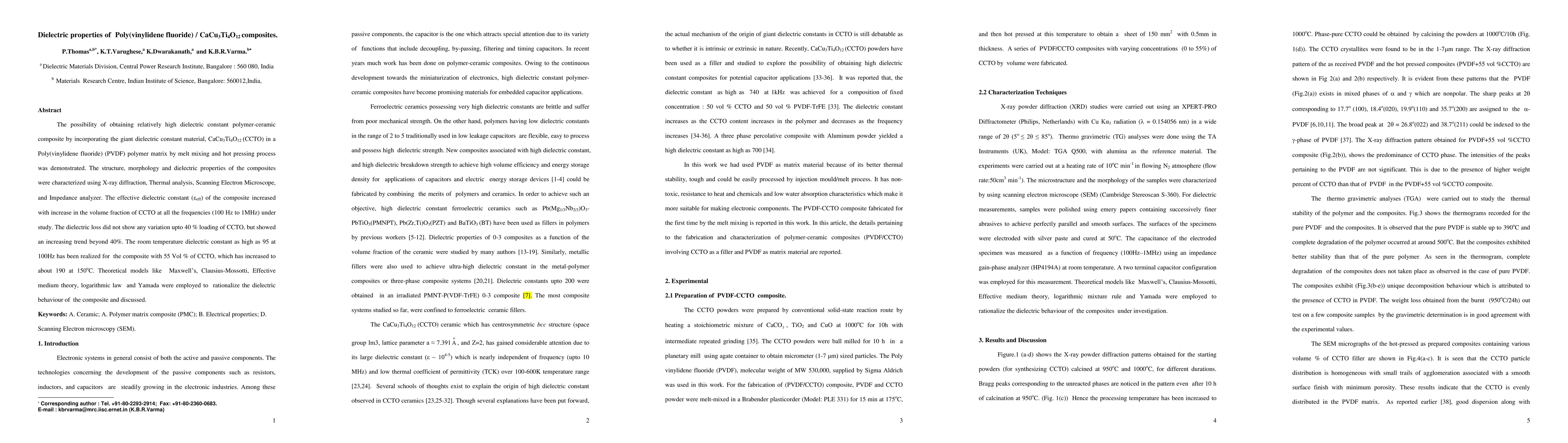 This study investigates the dielectric properties of Poly(vinylidene fluoride) (PVDF) composites reinforced with CaCu3Ti4O12 (CCTO) via melt mixing and hot pressing. The composite achieved high dielectric constants, reaching up to 190 at 150°C, and theoretical models were used to explain the composite's dielectric behavior.