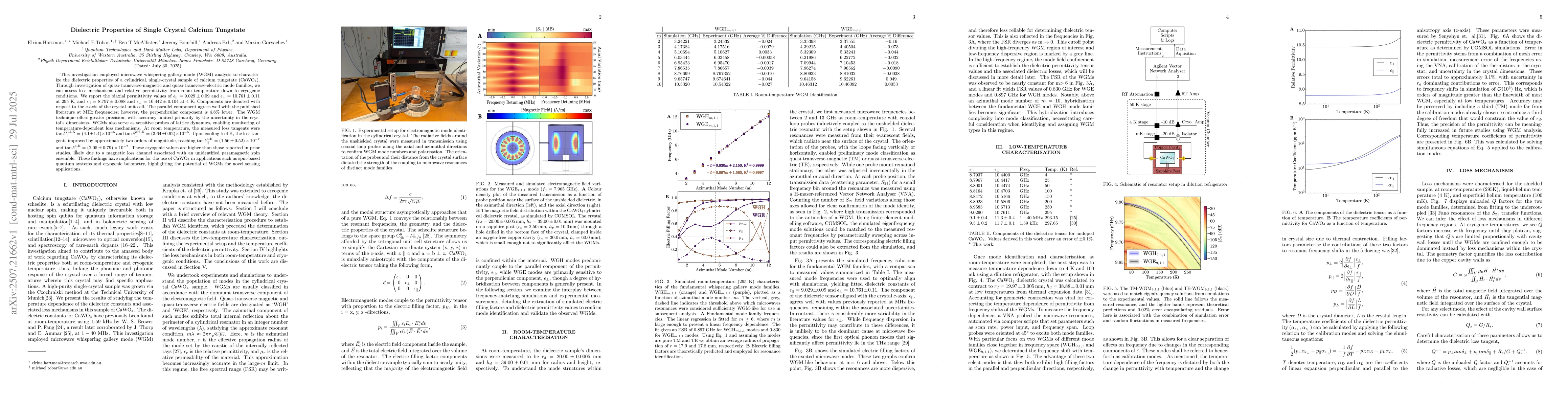 The study characterized the dielectric properties of single-crystal calcium tungstate (CaWO4) using microwave whispering gallery mode (WGM) analysis, investigating quasi-transverse magnetic and quasi-transverse electric mode families to assess loss mechanisms and relative permittivity from room temperature down to cryogenic conditions.