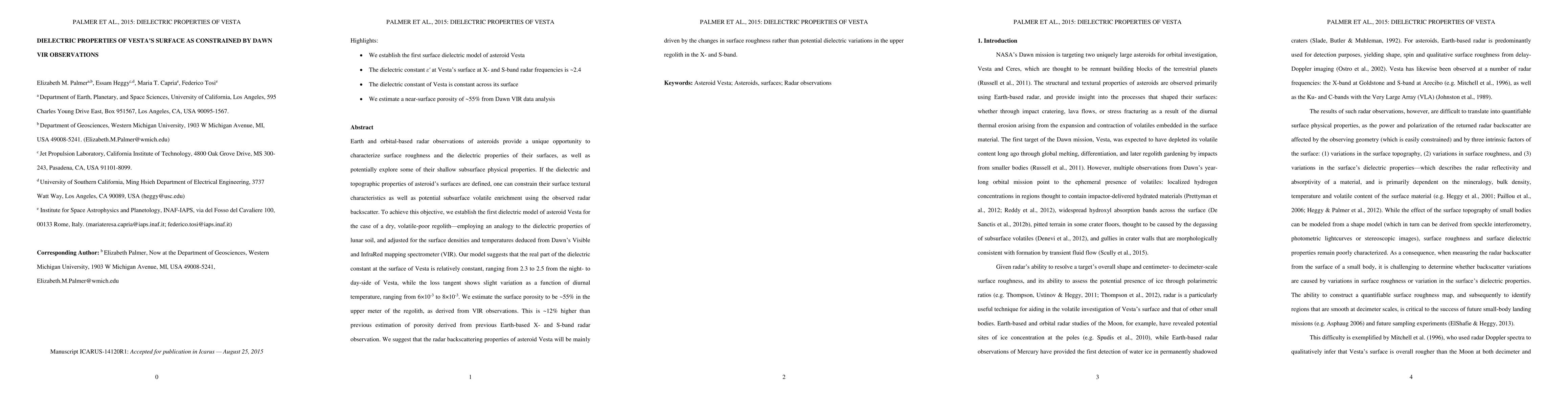 This paper establishes a dielectric model for asteroid Vesta using Dawn's VIR observations, finding a relatively constant real part of the dielectric constant (2.3-2.5) and a loss tangent (0.006-0.008) influenced by temperature. The study estimates surface porosity at ~55% in the upper meter of the regolith, suggesting radar backscattering is mainly driven by surface roughness.