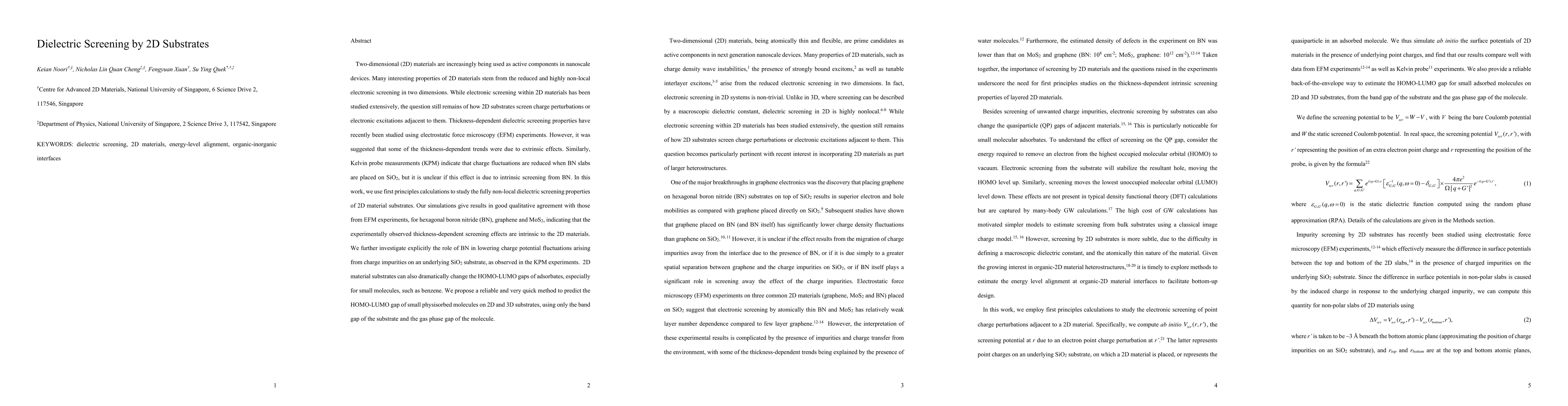 Two-dimensional (2D) materials are increasingly being used as active components in nanoscale devices. Many interesting properties of 2D materials stem from the reduced and highly non-local electronic screening in two dimensions. While electronic screening within 2D materials has been studied extensively, the question still remains of how 2D substrates screen charge perturbations or electronic excitations adjacent to them. Thickness-dependent dielectric screening properties have recently been studied using electrostatic force microscopy (EFM) experiments. However, it was suggested that some of the thickness-dependent trends were due to extrinsic effects. Similarly, Kelvin probe measurements (KPM) indicate that charge fluctuations are reduced when BN slabs are placed on SiO$_2$, but it is unclear if this effect is due to intrinsic screening from BN. In this work, we use first principles calculations to study the fully non-local dielectric screening properties of 2D material substrates. Our simulations give results in good qualitative agreement with those from EFM experiments, for hexagonal boron nitride (BN), graphene and MoS$_2$, indicating that the experimentally observed thickness-dependent screening effects are intrinsic to the 2D materials. We further investigate explicitly the role of BN in lowering charge potential fluctuations arising from charge impurities on an underlying SiO$_2$ substrate, as observed in the KPM experiments. 2D material substrates can also dramatically change the HOMO-LUMO gaps of adsorbates, especially for small molecules, such as benzene. We propose a reliable and very quick method to predict the HOMO-LUMO gap of small physisorbed molecules on 2D and 3D substrates, using only the band gap of the substrate and the gas phase gap of the molecule.