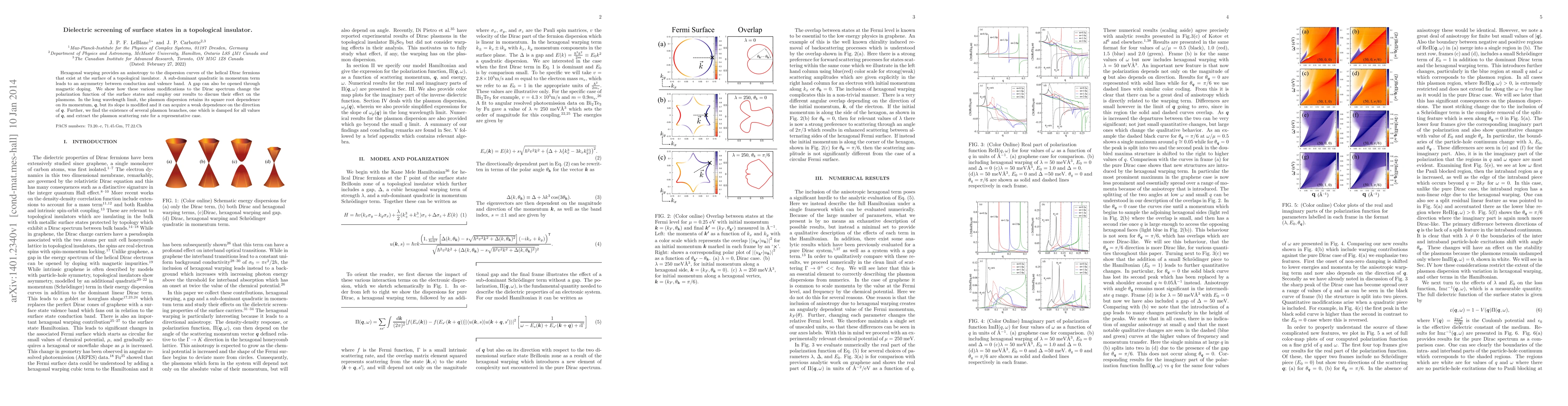 Hexagonal warping provides an anisotropy to the dispersion curves of the helical Dirac fermions that exist at the surface of a topological insulator. A sub-dominant quadratic in momentum term leads to an asymmetry between conduction and valence band. A gap can also be opened through magnetic doping. We show how these various modifications to the Dirac spectrum change the polarization function of the surface states and employ our results to discuss their effect on the plasmons. In the long wavelength limit, the plasmon dispersion retains its square root dependence on its momentum, $\boldsymbol{q}$, but its slope is modified and it can acquire a weak dependence on the direction of $\boldsymbol{q}$. Further, we find the existence of several plasmon branches, one which is damped for all values of $\boldsymbol{q}$, and extract the plasmon scattering rate for a representative case.