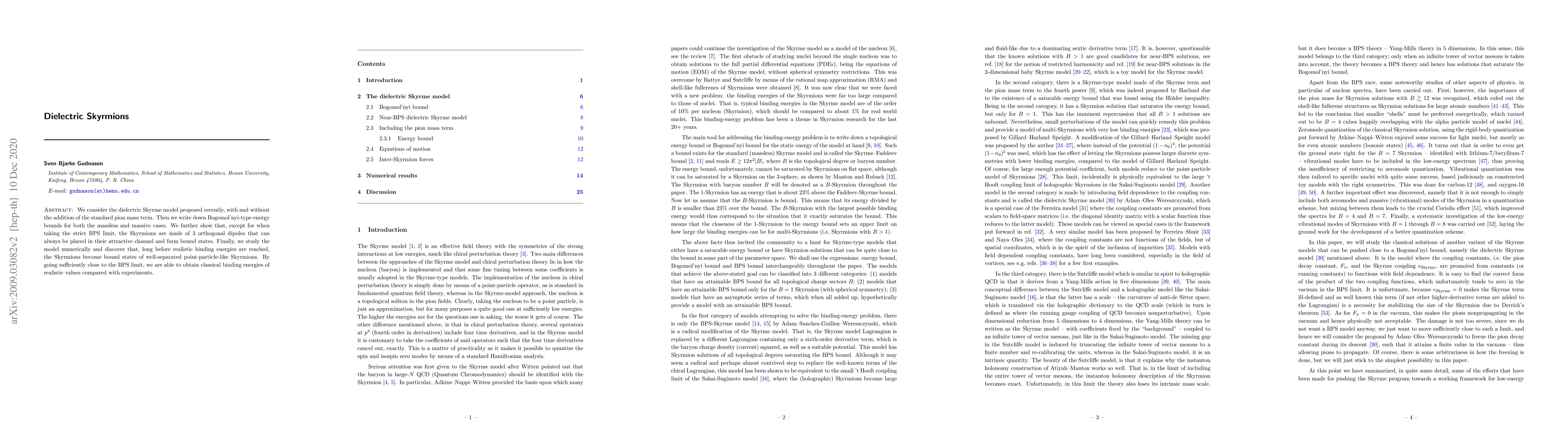 We consider the dielectric Skyrme model proposed recently, with and without the addition of the standard pion mass term. Then we write down Bogomol'nyi-type energy bounds for both the massless and massive cases. We further show that, except for when taking the strict BPS limit, the Skyrmions are made of 3 orthogonal dipoles that can always be placed in their attractive channel and form bound states. Finally, we study the model numerically and discover that, long before realistic binding energies are reached, the Skyrmions become bound states of well-separated point-particle-like Skyrmions. By going sufficiently close to the BPS limit, we are able to obtain classical binding energies of realistic values compared with experiments.