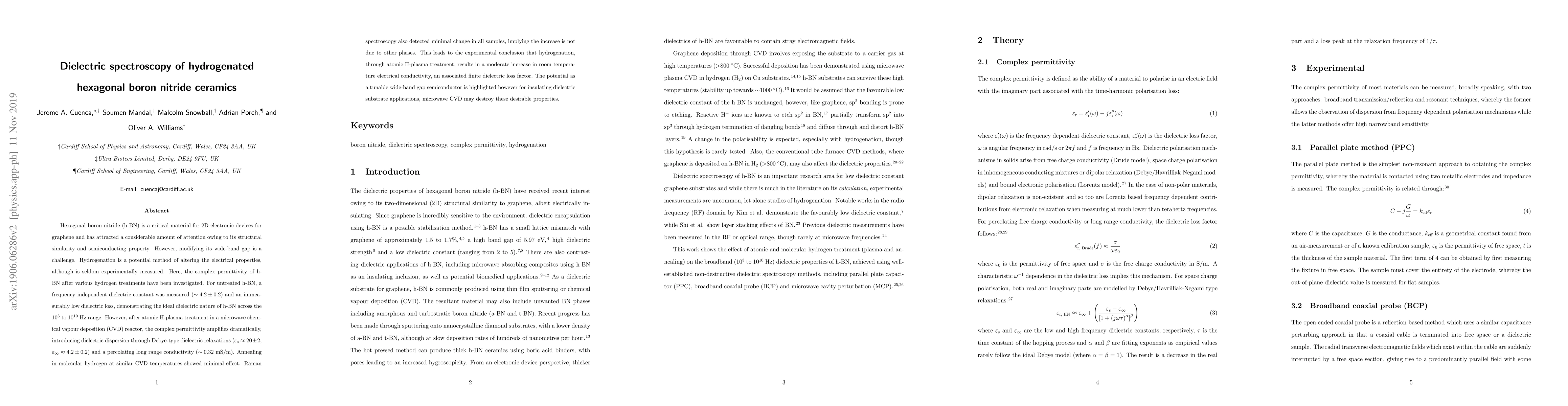 This study investigates the dielectric properties of hydrogenated hexagonal boron nitride (h-BN) ceramics, revealing that atomic H-plasma treatment significantly alters the complex permittivity, introducing dielectric dispersion and a finite dielectric loss factor, while minimally affecting the material's structure. The findings suggest hydrogenation can tune h-BN's electrical properties but may compromise its insulating nature for dielectric applications.