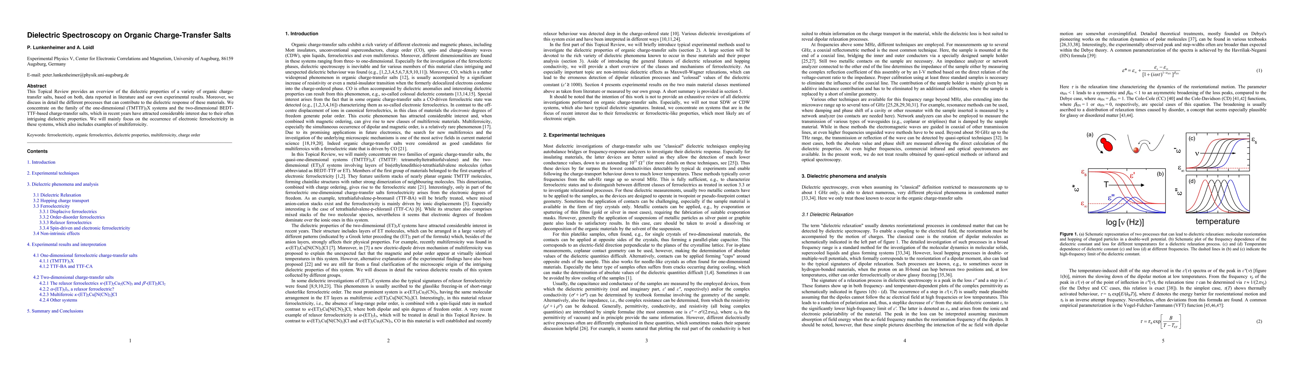 This review examines dielectric properties in organic charge-transfer salts, particularly focusing on the (TMTTF)2X and BEDT-TTF systems. It highlights electronic ferroelectricity and multiferroicity, drawing from both literature and new experimental data.