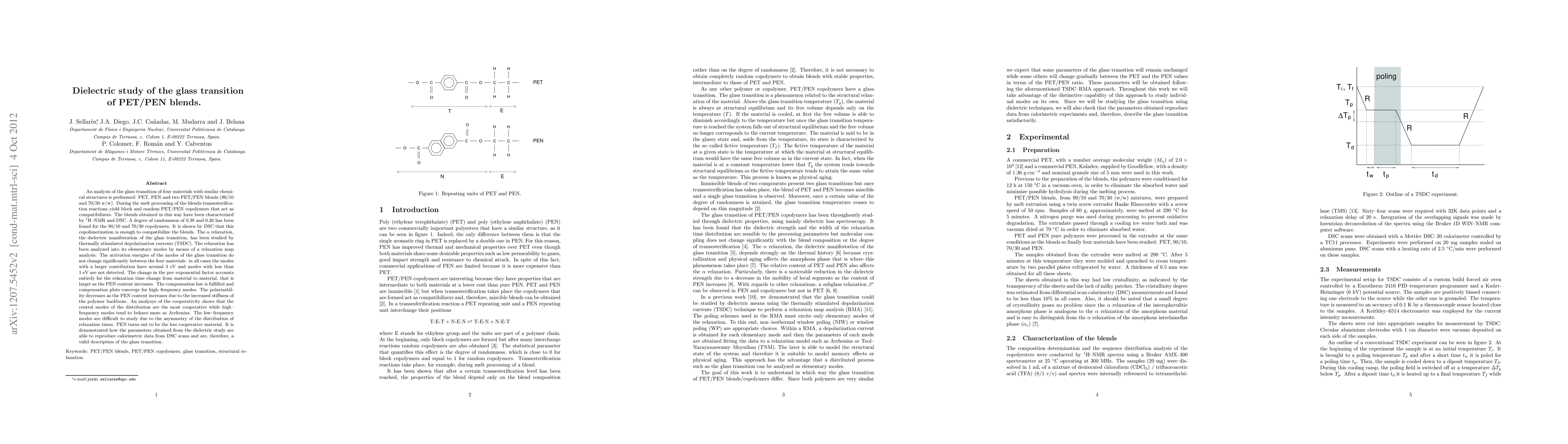 This study investigates the glass transition in PET/PEN blends using dielectric analysis and DSC, revealing that copolymerization through transesterification enhances blend compatibility. Dielectric measurements show consistent activation energies for relaxation modes but varying pre-exponential factors, with cooperativity highest in central modes and decreasing in higher frequency modes.