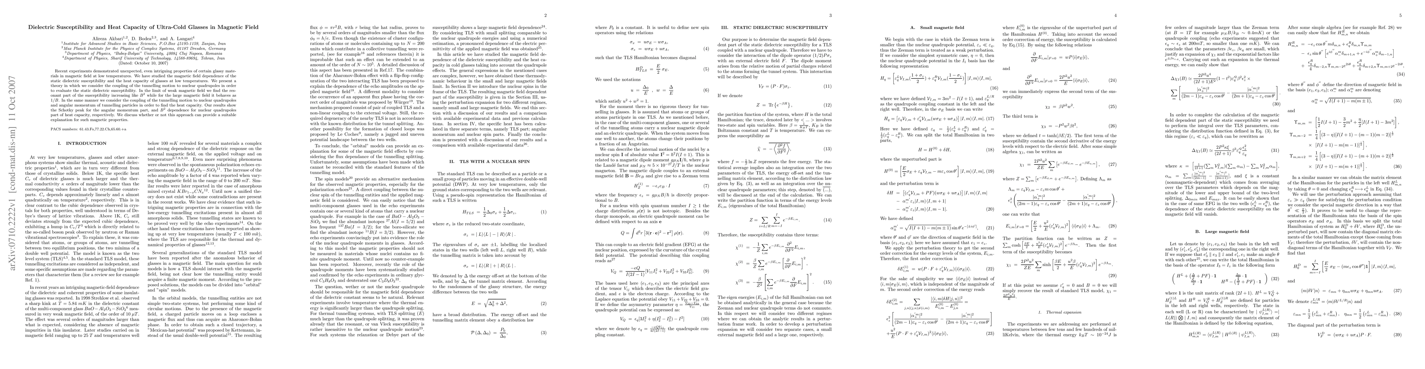 This paper investigates the magnetic field dependence of dielectric susceptibility and heat capacity in ultra-cold glasses, proposing a theory that links tunnelling motion to nuclear quadrupoles and angular momentum. The study finds a $B^2$ increase in susceptibility for weak fields and 1/B behavior for strong fields, along with a Schottky peak and $B^2$ dependence in heat capacity.
