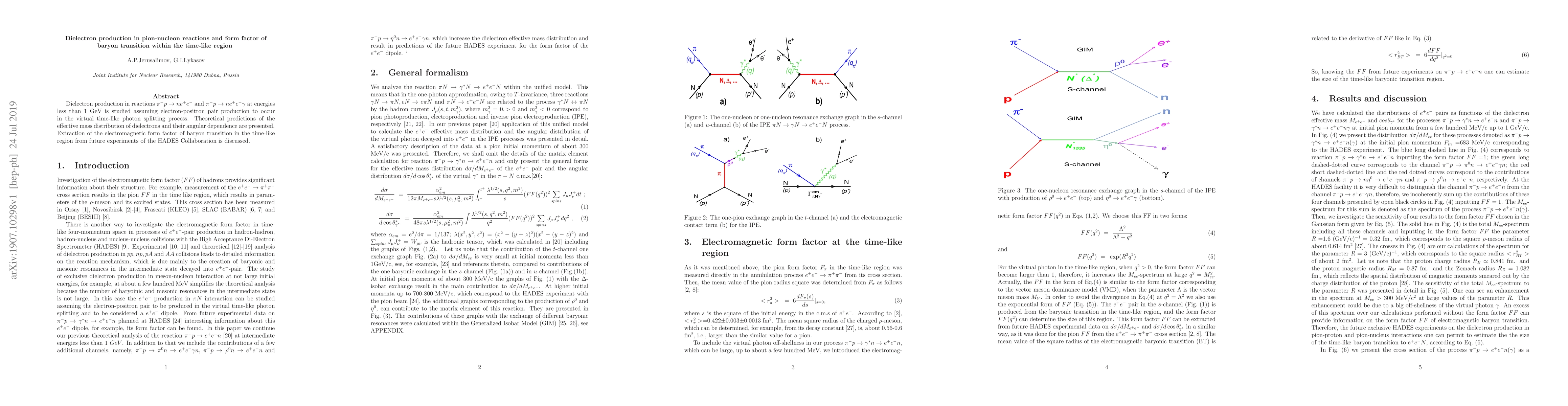 Dielectron production in reactions $\pi^- p \rightarrow n e^+e^-$ and $\pi^- p \rightarrow n e^+e^- \gamma$ at energies less than 1 GeV is studied assuming electron-positron pair production to occur in the virtual time-like photon splitting process. Theoretical predictions of the effective mass distribution of dielectrons and their angular dependence are presented. Extraction of the electromagnetic form factor of baryon transition in the time-like region from future experiments of the HADES Collaboration is discussed.