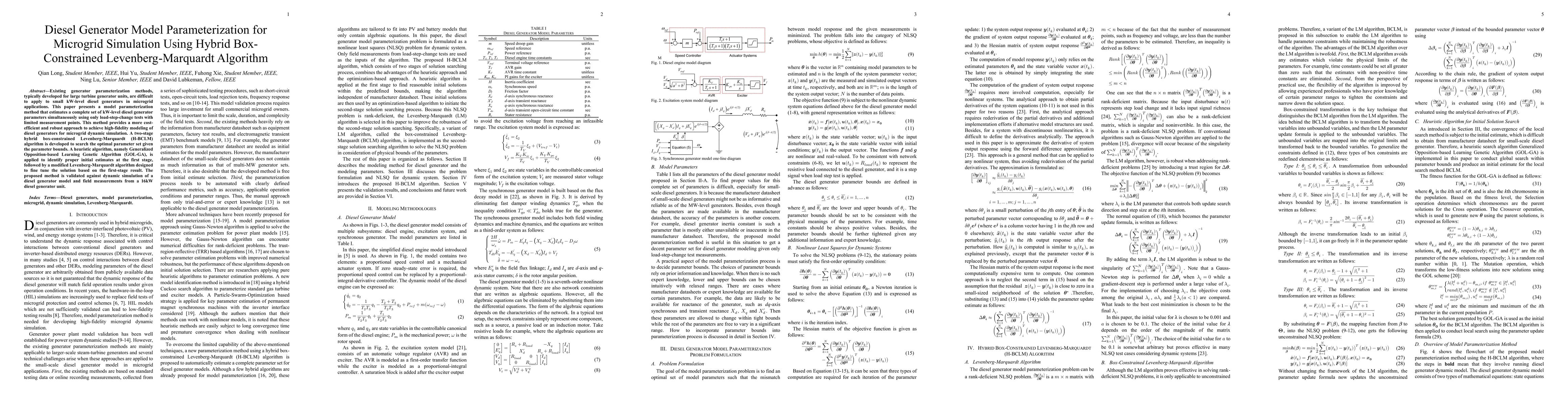 Existing generator parameterization methods, typically developed for large turbine generator units, are difficult to apply to small kW-level diesel generators in microgrid applications. This paper presents a model parameterization method that estimates a complete set of kW-level diesel generator parameters simultaneously using only load-step-change tests with limited measurement points. This method provides a more cost-efficient and robust approach to achieve high-fidelity modeling of diesel generators for microgrid dynamic simulation. A two-stage hybrid box-constrained Levenberg-Marquardt (H-BCLM) algorithm is developed to search the optimal parameter set given the parameter bounds. A heuristic algorithm, namely Generalized Opposition-based Learning Genetic Algorithm (GOL-GA), is applied to identify proper initial estimates at the first stage, followed by a modified Levenberg-Marquardt algorithm designed to fine tune the solution based on the first-stage result. The proposed method is validated against dynamic simulation of a diesel generator model and field measurements from a 16kW diesel generator unit.