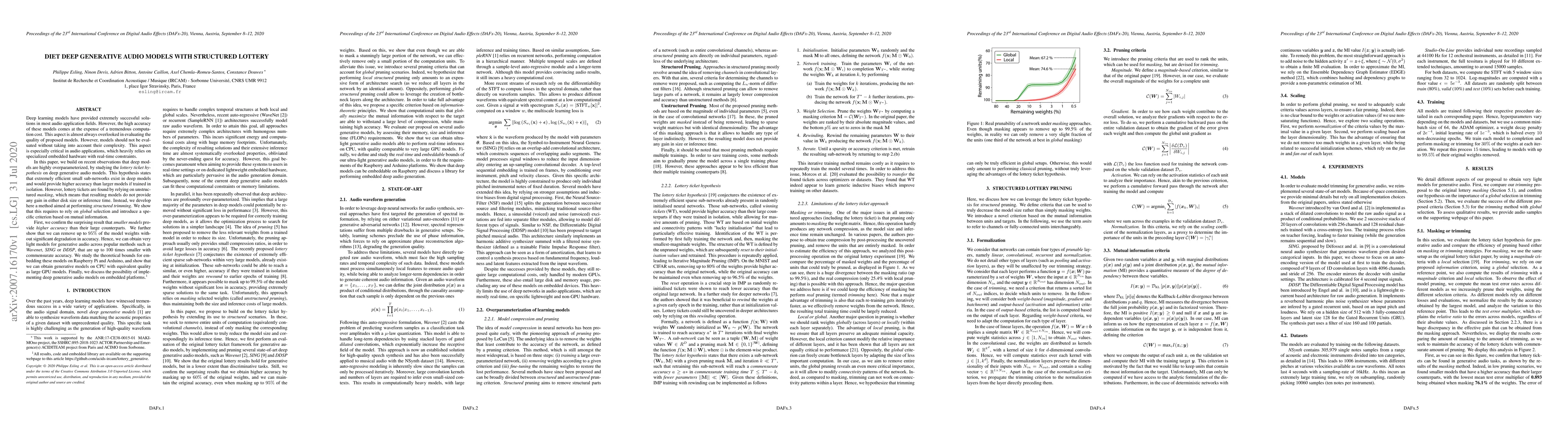 Deep learning models have provided extremely successful solutions in most audio application fields. However, the high accuracy of these models comes at the expense of a tremendous computation cost. This aspect is almost always overlooked in evaluating the quality of proposed models. However, models should not be evaluated without taking into account their complexity. This aspect is especially critical in audio applications, which heavily relies on specialized embedded hardware with real-time constraints. In this paper, we build on recent observations that deep models are highly overparameterized, by studying the lottery ticket hypothesis on deep generative audio models. This hypothesis states that extremely efficient small sub-networks exist in deep models and would provide higher accuracy than larger models if trained in isolation. However, lottery tickets are found by relying on unstructured masking, which means that resulting models do not provide any gain in either disk size or inference time. Instead, we develop here a method aimed at performing structured trimming. We show that this requires to rely on global selection and introduce a specific criterion based on mutual information. First, we confirm the surprising result that smaller models provide higher accuracy than their large counterparts. We further show that we can remove up to 95% of the model weights without significant degradation in accuracy. Hence, we can obtain very light models for generative audio across popular methods such as Wavenet, SING or DDSP, that are up to 100 times smaller with commensurate accuracy. We study the theoretical bounds for embedding these models on Raspberry Pi and Arduino, and show that we can obtain generative models on CPU with equivalent quality as large GPU models. Finally, we discuss the possibility of implementing deep generative audio models on embedded platforms.