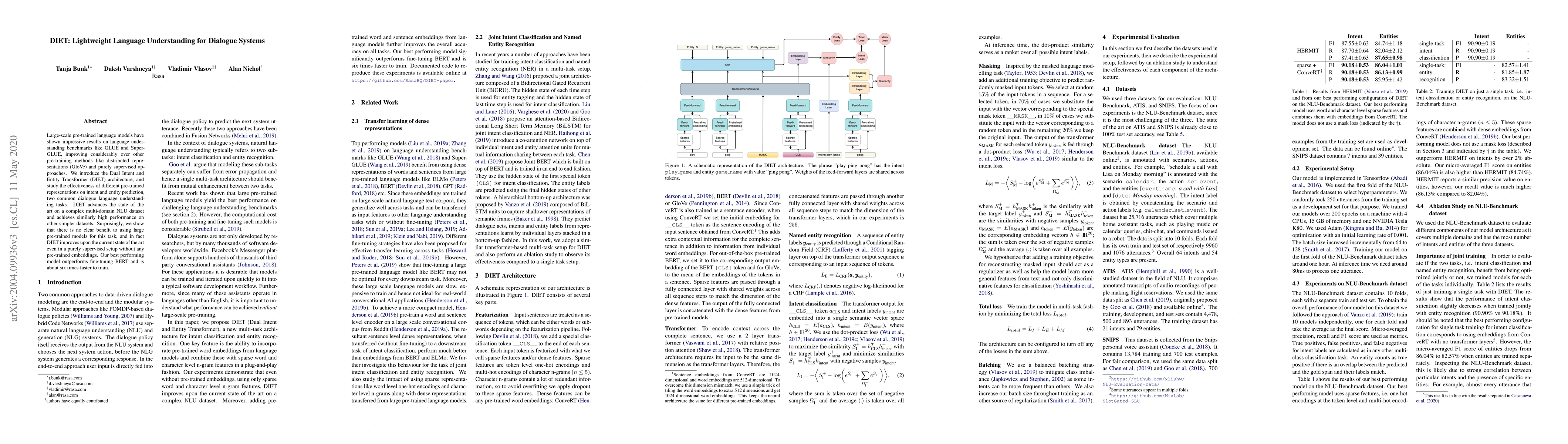 The Dual Intent and Entity Transformer (DIET) architecture improves dialogue language understanding tasks without large pre-trained models, outperforming BERT and achieving six times faster training speed.