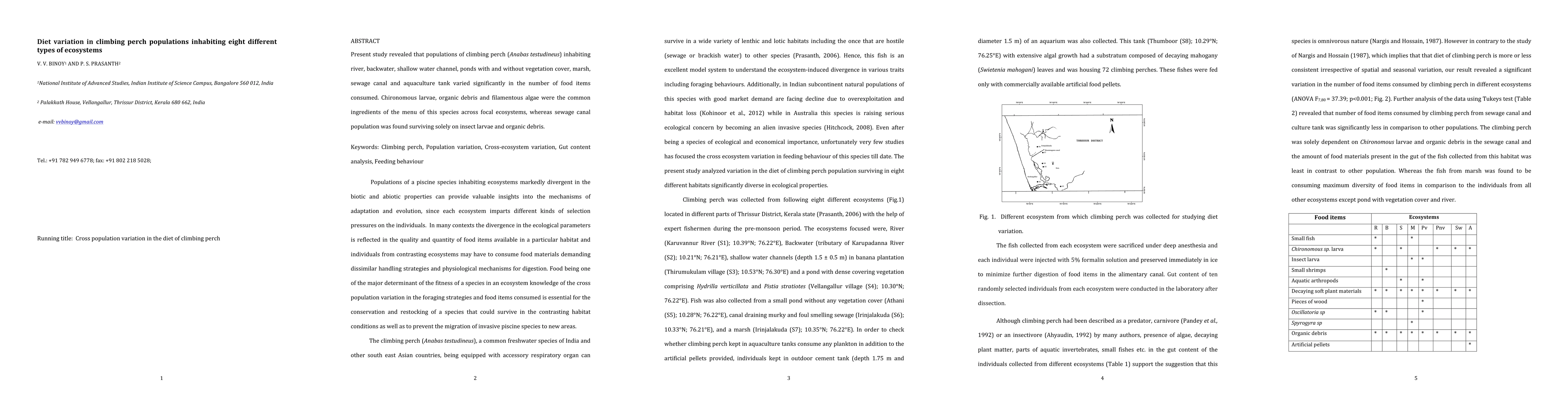 The present study revealed that populations of climbing perch (Anabas testudineus) inhabiting river, backwater, shallow water channel, ponds with and without vegetation cover, marsh, sewage canal and aquaculture tank varied significantly in the number of food items consumed. Chironomous larvae, organic debris and filamentous algae were the common ingredients of the menu of this species across focal ecosystems, whereas sewage canal population was found surviving solely on insect larvae and organic debris.