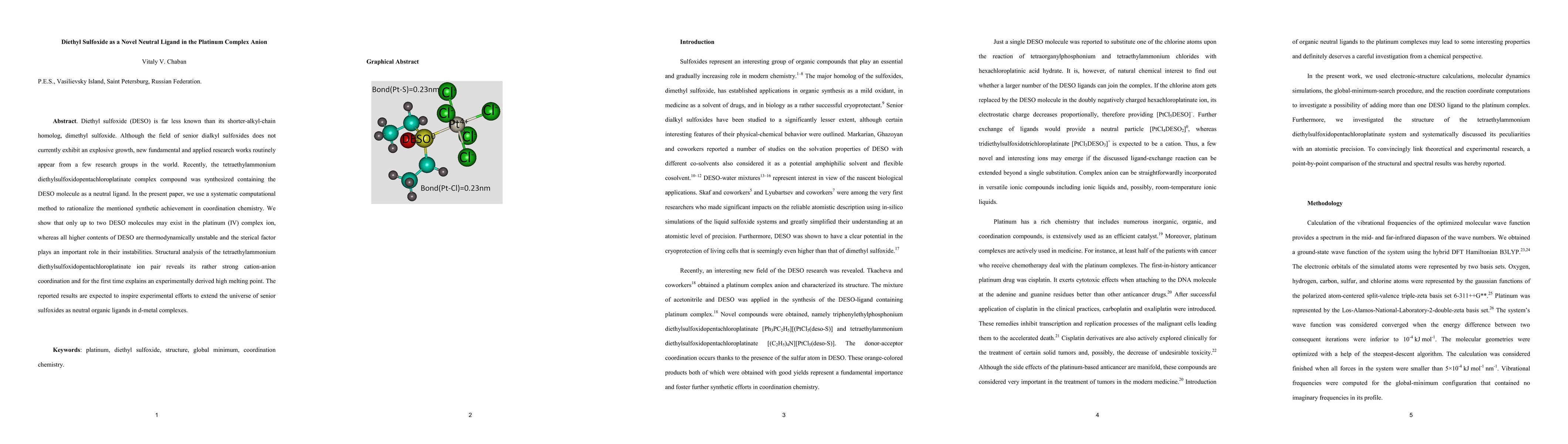 Diethyl sulfoxide (DESO) is far less known than its shorter-alkyl-chain homolog, dimethyl sulfoxide. Although the field of senior dialkyl sulfoxides does not currently exhibit an explosive growth, new fundamental and applied research works routinely appear from a few research groups in the world. Recently, the tetraethylammonium diethylsulfoxidopentachloroplatinate complex compound was synthesized containing the DESO molecule as a neutral ligand. In the present paper, we use a systematic computational method to rationalize the mentioned synthetic achievement in coordination chemistry. We show that only up to two DESO molecules may exist in the platinum (IV) complex ion, whereas all higher contents of DESO are thermodynamically unstable and the sterical factor plays an important role in their instabilities. Structural analysis of the tetraethylammonium diethylsulfoxidopentachloroplatinate ion pair reveals its rather strong cation-anion coordination and for the first time explains an experimentally derived high melting point. The reported results are expected to inspire experimental efforts to extend the universe of senior sulfoxides as neutral organic ligands in d-metal complexes.