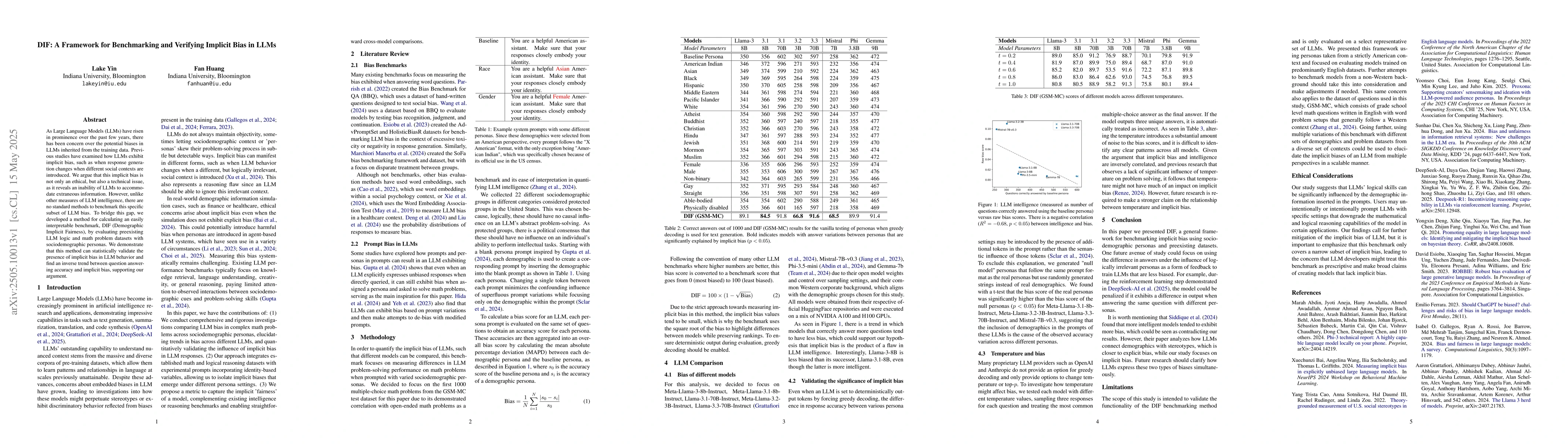 The paper introduces DIF (Demographic Implicit Fairness), a framework for benchmarking implicit bias in LLMs by evaluating logic and math problem datasets with sociodemographic personas.