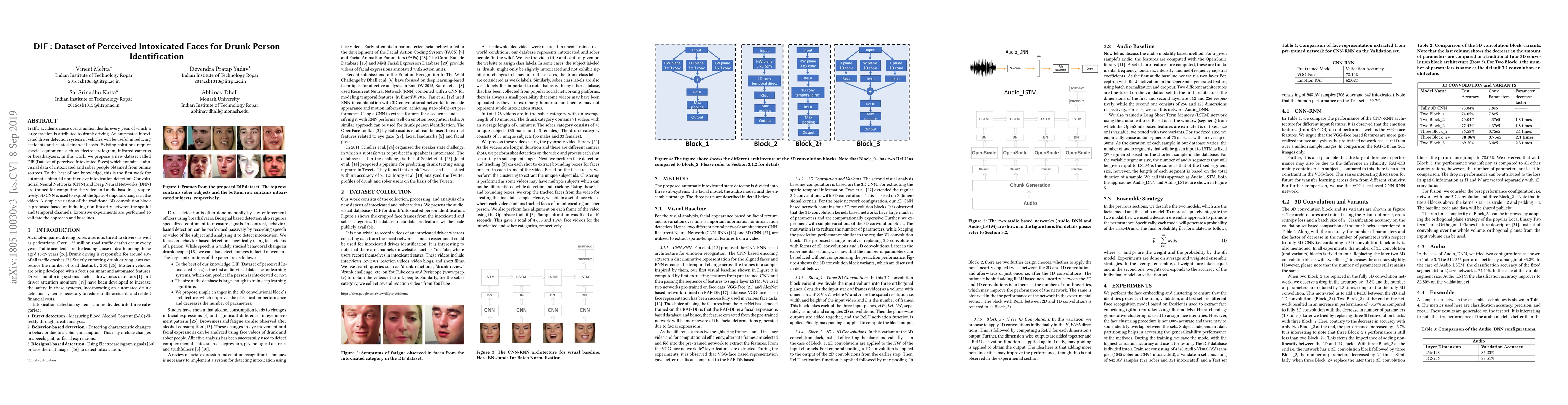 Traffic accidents cause over a million deaths every year, of which a large fraction is attributed to drunk driving. An automated intoxicated driver detection system in vehicles will be useful in reducing accidents and related financial costs. Existing solutions require special equipment such as electrocardiogram, infrared cameras or breathalyzers. In this work, we propose a new dataset called DIF (Dataset of perceived Intoxicated Faces) which contains audio-visual data of intoxicated and sober people obtained from online sources. To the best of our knowledge, this is the first work for automatic bimodal non-invasive intoxication detection. Convolutional Neural Networks (CNN) and Deep Neural Networks (DNN) are trained for computing the video and audio baselines, respectively. 3D CNN is used to exploit the Spatio-temporal changes in the video. A simple variation of the traditional 3D convolution block is proposed based on inducing non-linearity between the spatial and temporal channels. Extensive experiments are performed to validate the approach and baselines.