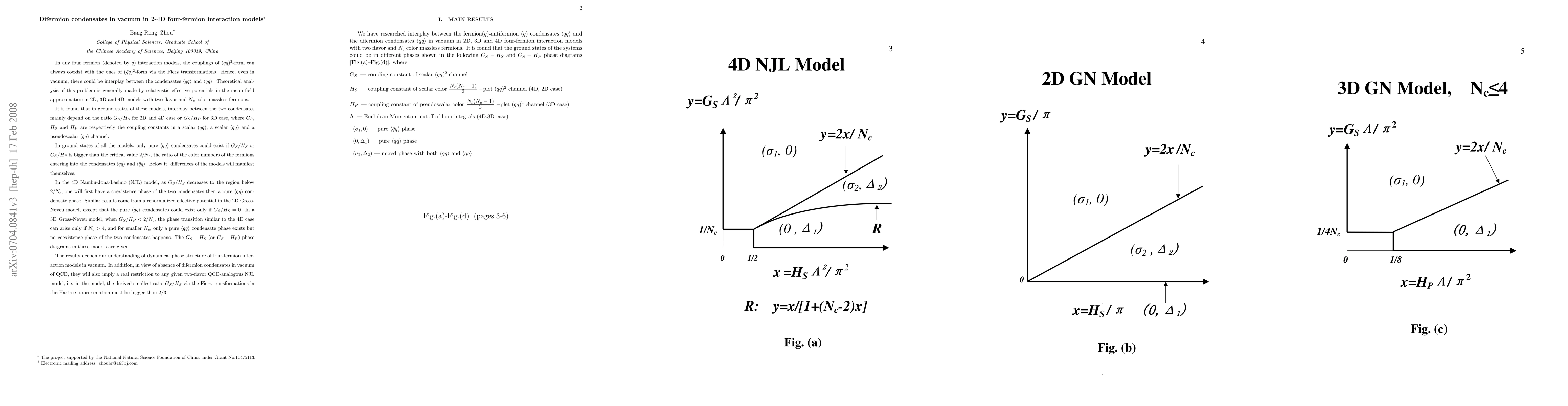This paper investigates the interplay between $<\bar{q}q>$ and $<qq>$ condensates in vacuum across 2D to 4D four-fermion interaction models, finding that the ratio of coupling constants $G_S/H_S$ or $G_S/H_P$ determines the coexistence or absence of these condensates in the ground state.