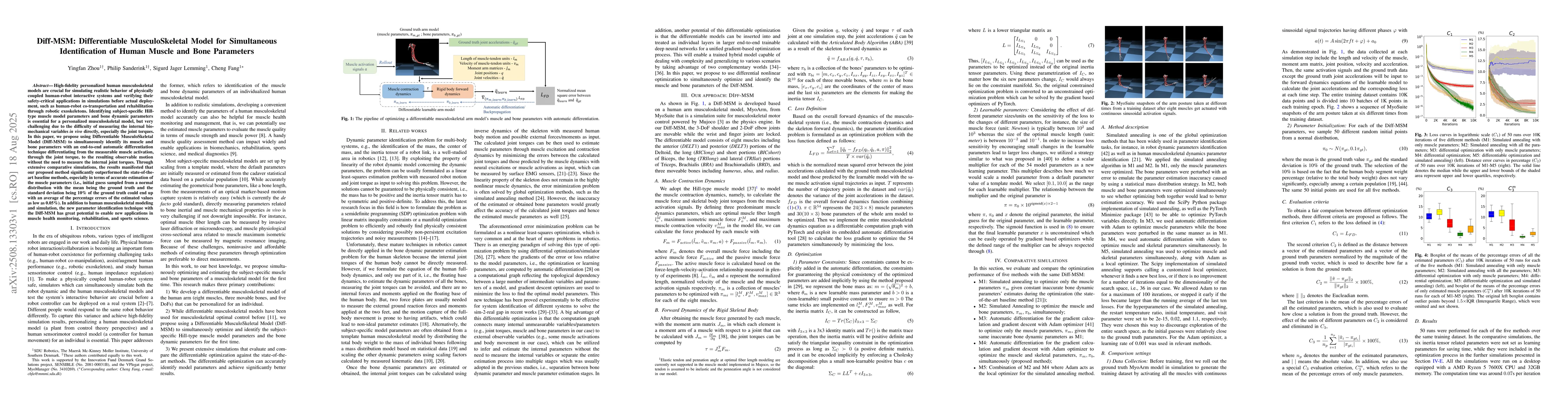High-fidelity personalized human musculoskeletal models are crucial for simulating realistic behavior of physically coupled human-robot interactive systems and verifying their safety-critical applications in simulations before actual deployment, such as human-robot co-transportation and rehabilitation through robotic exoskeletons. Identifying subject-specific Hill-type muscle model parameters and bone dynamic parameters is essential for a personalized musculoskeletal model, but very challenging due to the difficulty of measuring the internal biomechanical variables in vivo directly, especially the joint torques. In this paper, we propose using Differentiable MusculoSkeletal Model (Diff-MSM) to simultaneously identify its muscle and bone parameters with an end-to-end automatic differentiation technique differentiating from the measurable muscle activation, through the joint torque, to the resulting observable motion without the need to measure the internal joint torques. Through extensive comparative simulations, the results manifested that our proposed method significantly outperformed the state-of-the-art baseline methods, especially in terms of accurate estimation of the muscle parameters (i.e., initial guess sampled from a normal distribution with the mean being the ground truth and the standard deviation being 10% of the ground truth could end up with an average of the percentage errors of the estimated values as low as 0.05%). In addition to human musculoskeletal modeling and simulation, the new parameter identification technique with the Diff-MSM has great potential to enable new applications in muscle health monitoring, rehabilitation, and sports science.
