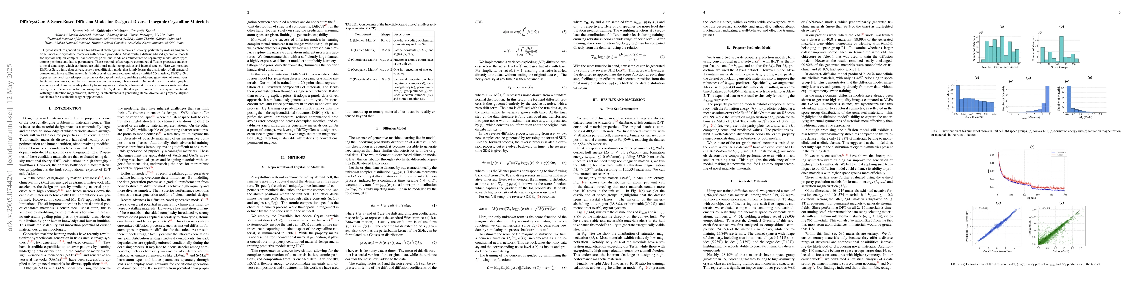 DiffCrysGen is a new, data-driven score-based diffusion model that generates diverse inorganic crystalline materials. It unifies atom types, positions, and lattice parameters into 2D matrices, eliminating the need for complex priors or modular architectures, and demonstrating effectiveness in designing rare-earth-free magnetic materials with high saturation magnetization.