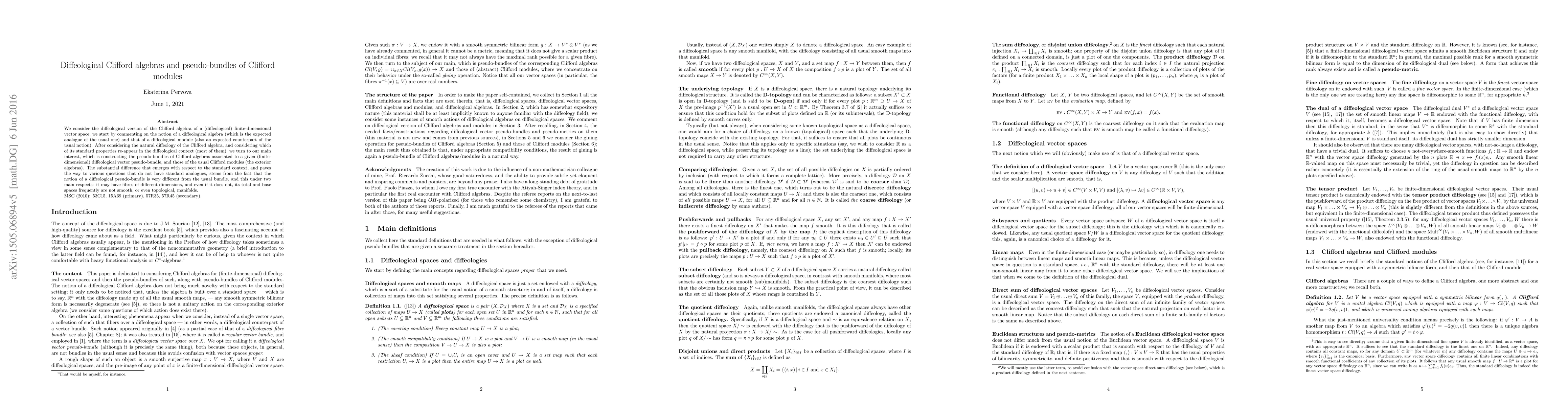 This paper investigates diffeological versions of Clifford algebras and modules, constructing pseudo-bundles through diffeological gluing. It elaborates on the foundational concepts of diffeological algebras and modules, followed by an in-depth discussion on the diffeology of Clifford algebras and the construction of associated pseudo-bundles.