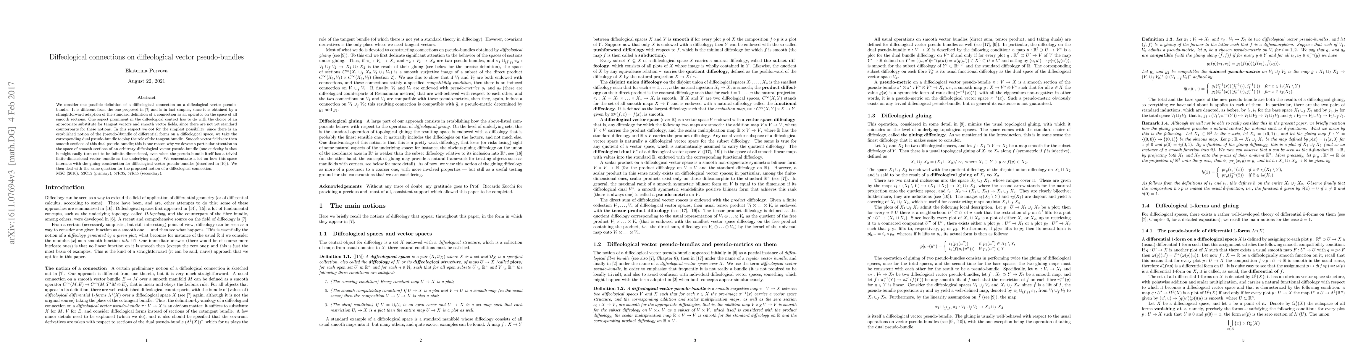 This paper proposes a simplified definition of a diffeological connection on a diffeological vector pseudo-bundle, contrasting with prior definitions. It utilizes the bundle of differential forms' dual pseudo-bundle as a substitute for the tangent bundle, focusing on the interaction of smooth sections with the gluing construction of these bundles.