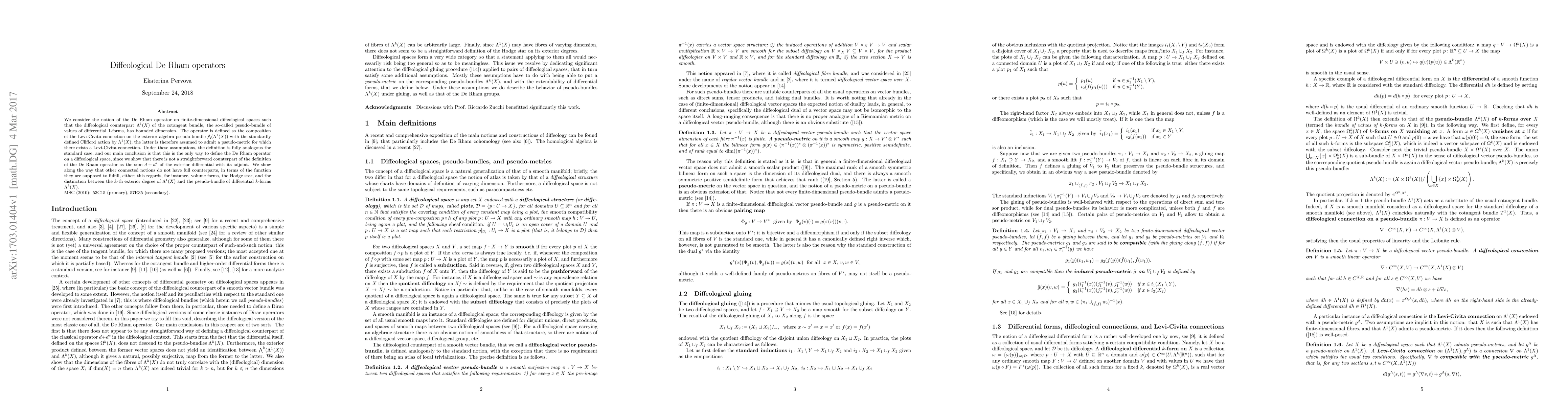 This paper defines the De Rham operator on finite-dimensional diffeological spaces using the Levi-Civita connection and Clifford action, showing it is the only viable definition. It also discusses the absence of straightforward counterparts for volume forms, Hodge star, and the distinction between differential forms and their bundles.