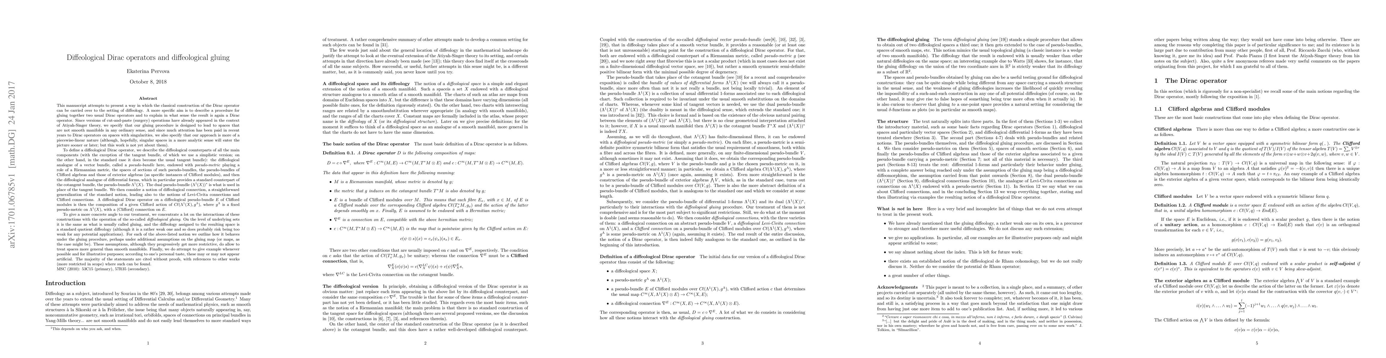 This manuscript attempts to present a way in which the classical construction of the Dirac operator can be carried over to the setting of diffeology. A more specific aim is to describe a procedure for gluing together two usual Dirac operators and to explain in what sense the result is again a Dirac operator. Since versions of cut-and-paste (surgery) operations have already appeared in the context of Atiyah-Singer theory, we specify that our gluing procedure is designed to lead to spaces that are not smooth manifolds in any ordinary sense, and since much attention has been paid in recent years to Dirac operators on spaces with singularities, we also specify that our approach is more of a piecewise-linear nature (although, hopefully, singular spaces in a more analytic sense will enter the picture sooner or later; but this work is not yet about them). Most of it is devoted to the diffeological versions of the components that go into the standard definition of a Dirac operator as the composition of a Clifford connection with Clifford action by sections of the cotangent bundle; a diffeological Dirac operator is then standardly defined.