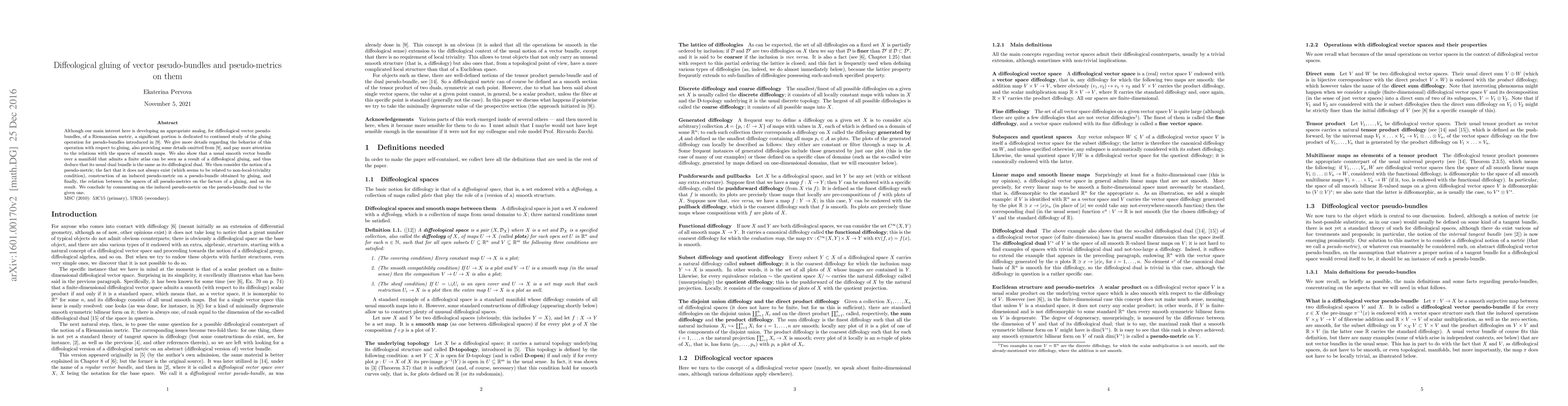 This paper develops an analog of Riemannian metrics for diffeological vector pseudo-bundles, focusing on the gluing operation for pseudo-bundles and exploring their relation to smooth maps. It also examines the existence and construction of pseudo-metrics on glued pseudo-bundles and concludes with the induced pseudo-metric on their dual bundles.